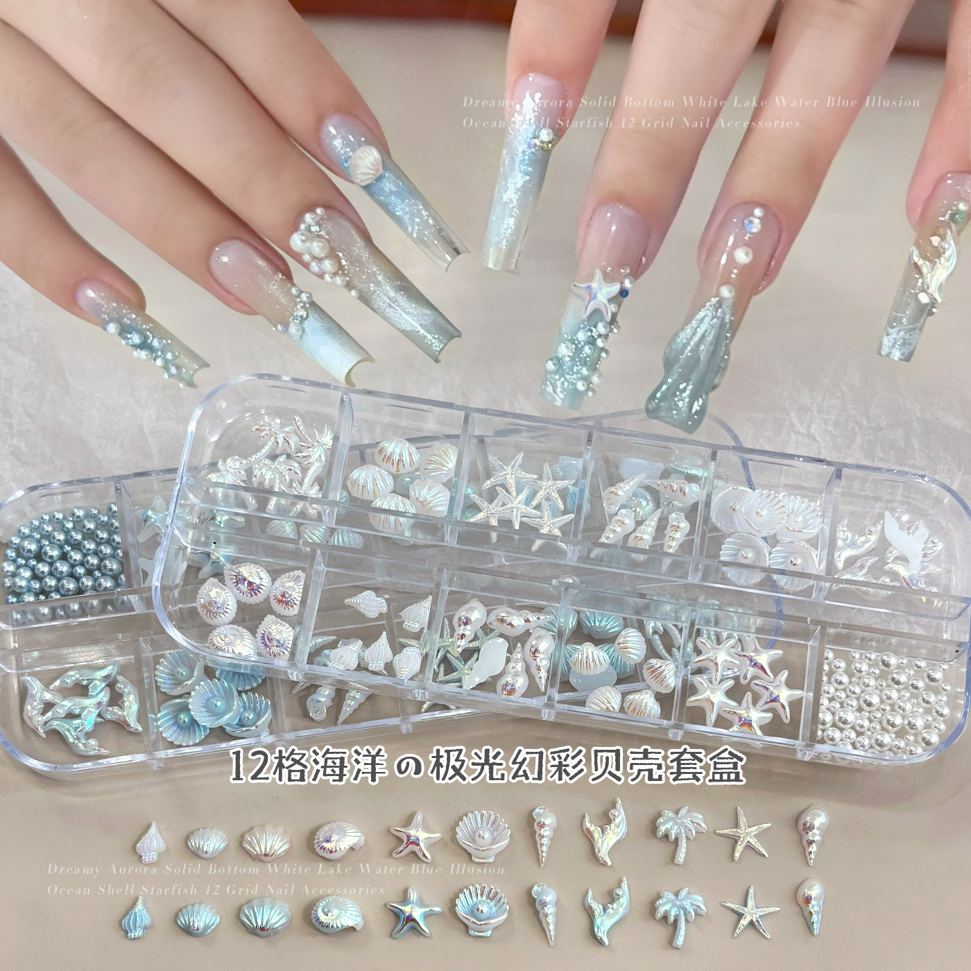 12格海星贝壳美甲饰品套盒跨境爆款极光海螺椰树diy穿戴甲钻配饰