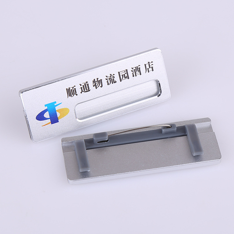 創意印刷金属工号ブランド会社のホテルの名前はブランドのシルク印アルミニウム合金社員の胸印です。ロゴを印刷できます。