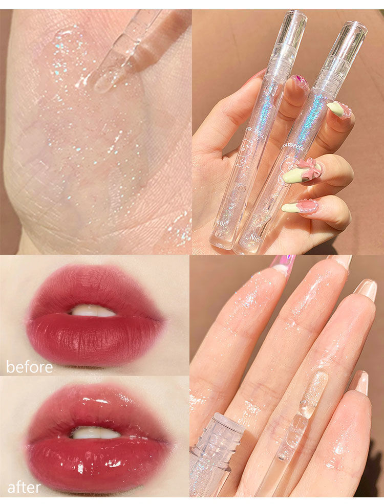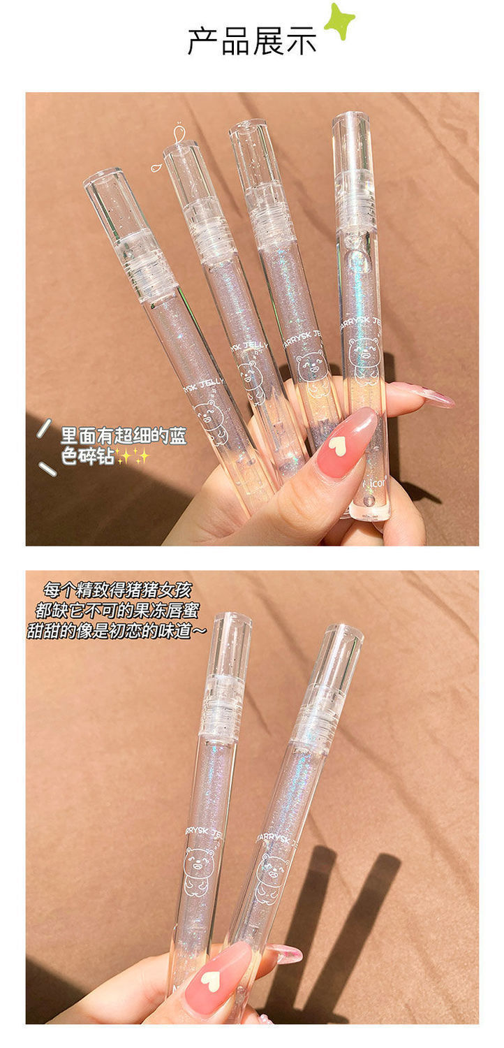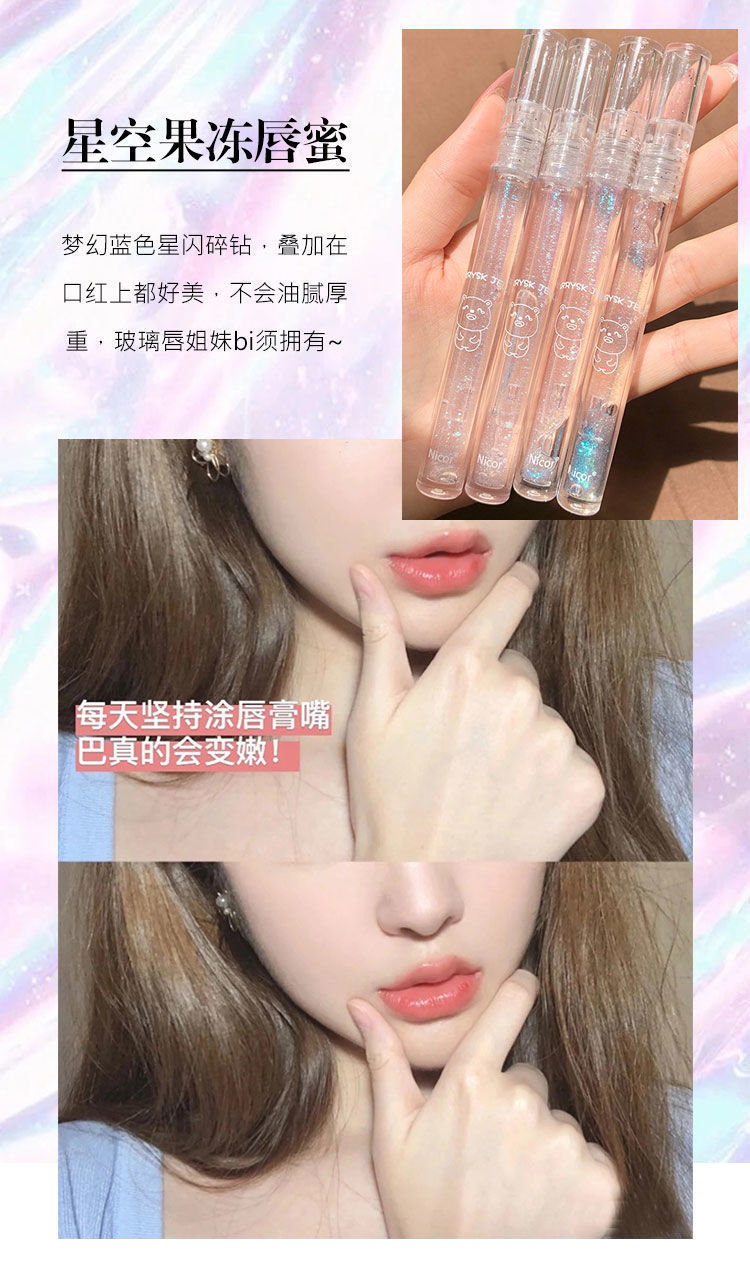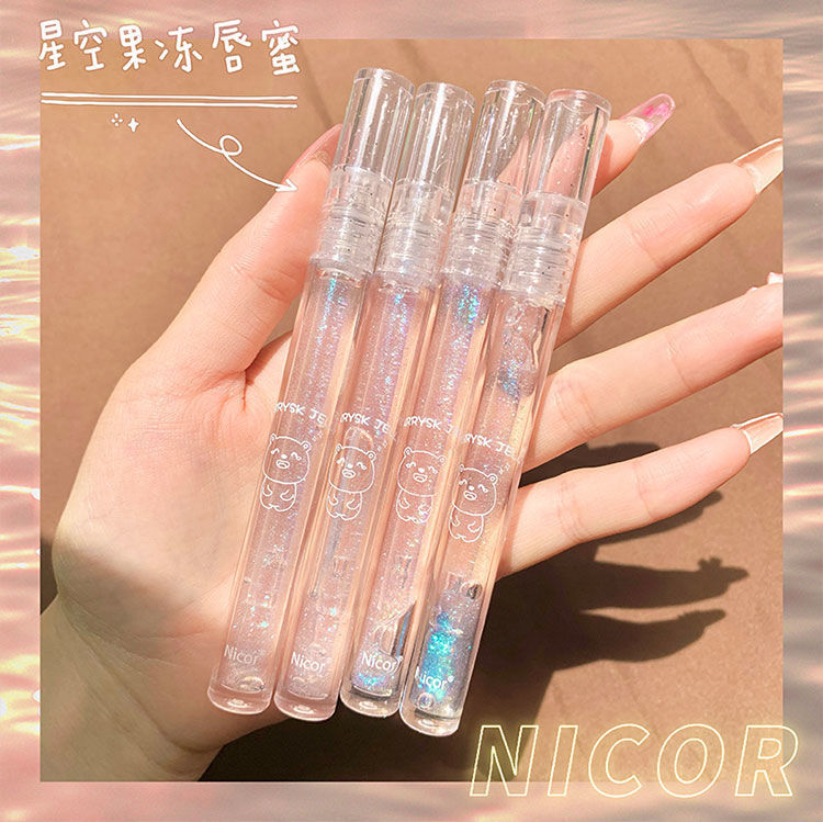ニコールティーカップ熊鏡面水光ジュースブツブツ唇蜜透明無色青フラッシュ口紅潤い唇油唇彩
