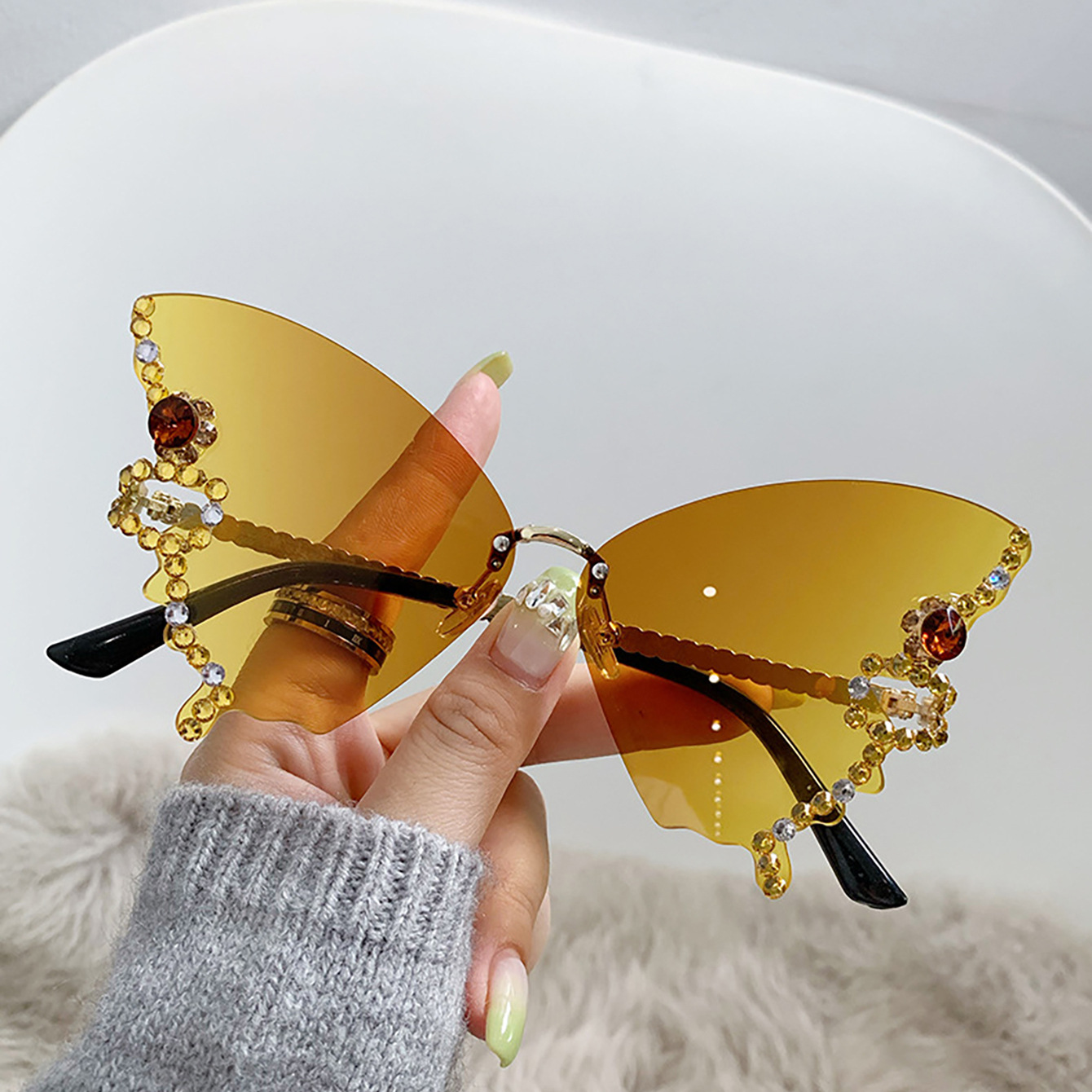 2025 クロスボーダーリムレスダイヤモンドハイエンドサングラス女性のファッション新しい蝶の形のパーソナライズされた誇張サングラス