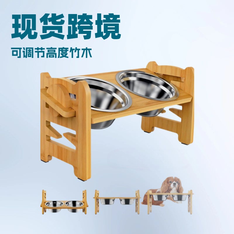 国境を越えた現地販売の竹製ペットボウルスタンド、調節可能な犬用ケージ、ダブルボウル、小型犬・中型犬・猫用スタンド、ドッグフード