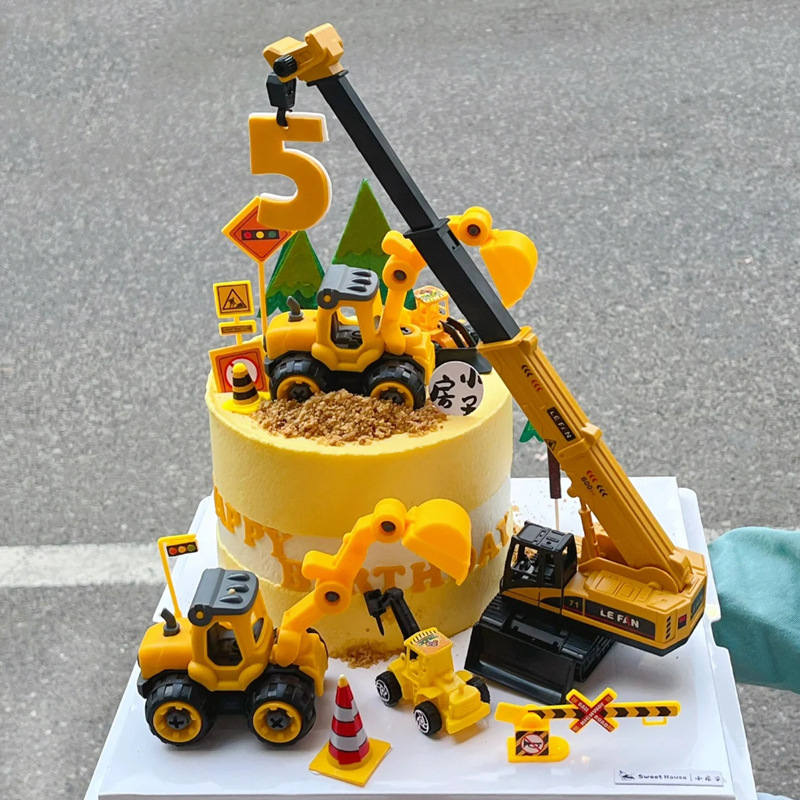 プラスチック製の掘削機ケーキデコレーション、工事用ブルドーザー、交通障害物、クレーンタワー、子供用誕生日セット卸売