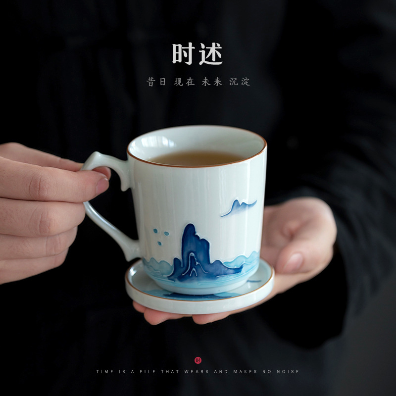 時述陶磁器手描き中国式ハンドル付きカップ手作りコップ大容量オフィス家庭用泡茶影青浮き彫り