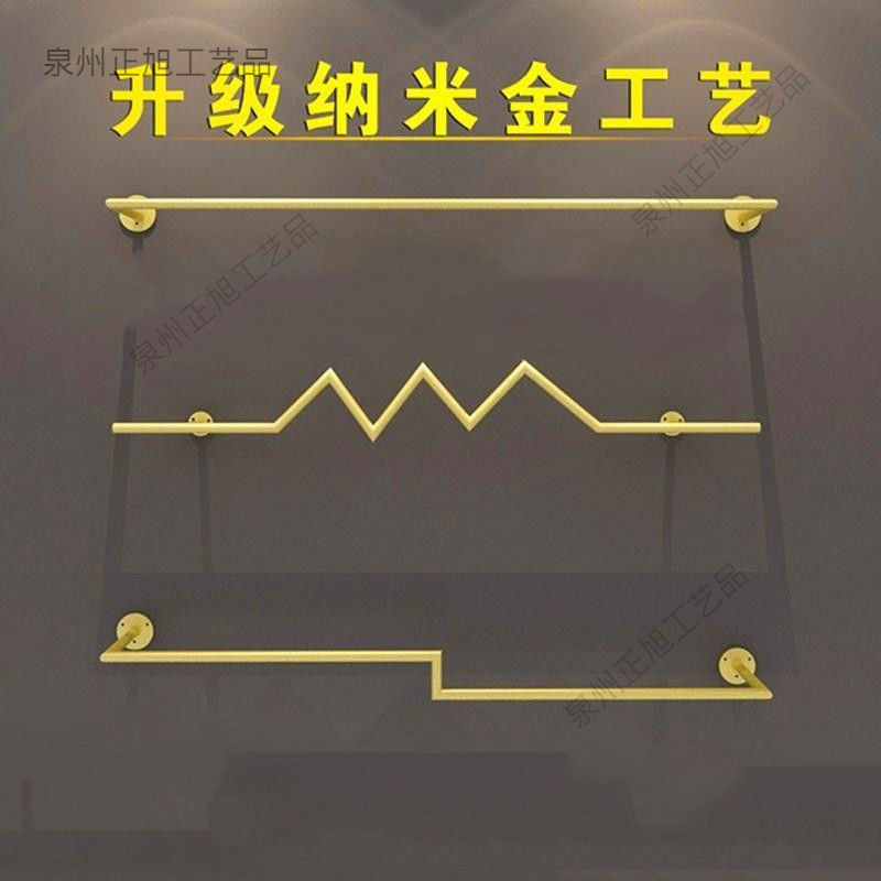 子供服店の展示棚はシンプルで壁掛け式の金色の展示棚を組み合わせて壁の鉄芸のハンガーの洋服店の棚を掛けます。