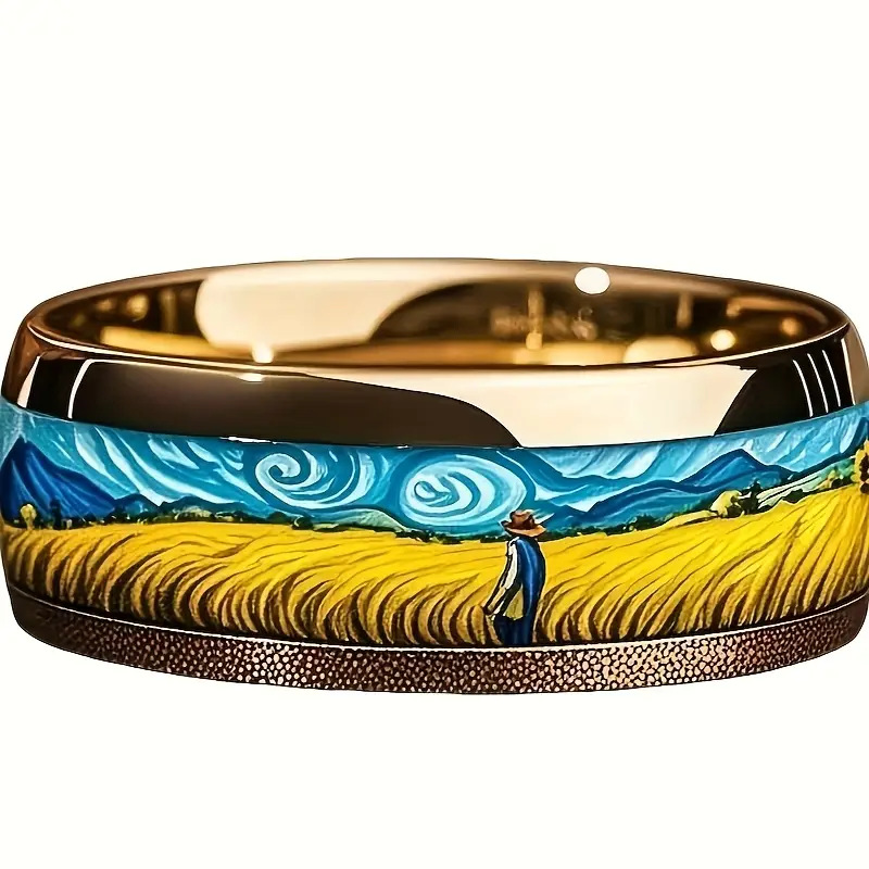 ステンレス製の指輪に、ゴッホの孤独と希望が描かれています。個性的な指輪、ローズゴールドのゴッホの麦畑の小人。