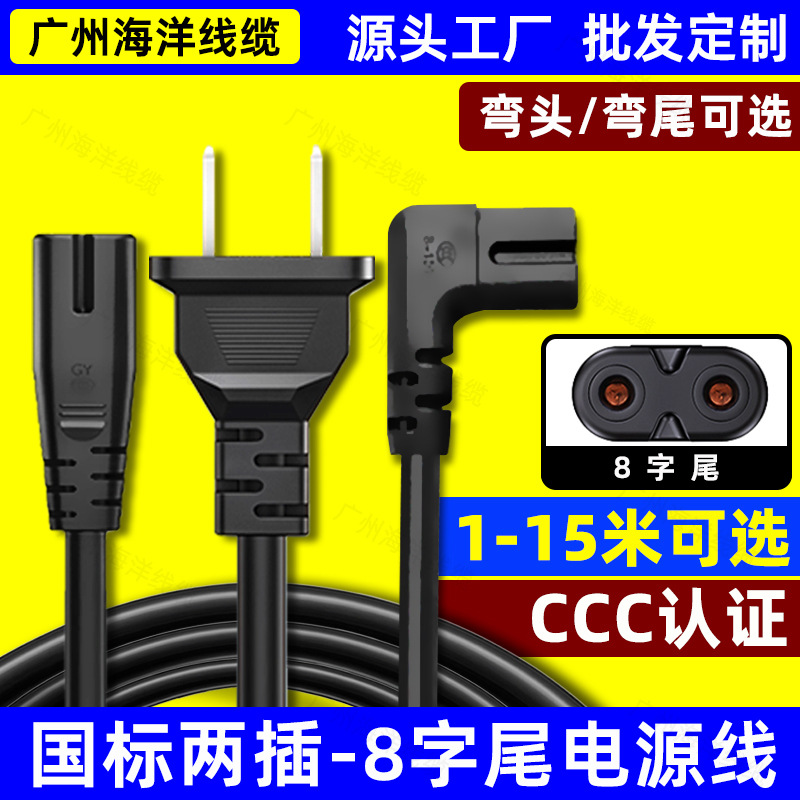 国標二差8字電源コード2芯プラグ付き八字尾エルボ黒白色1.5/2/3/5/10メートル