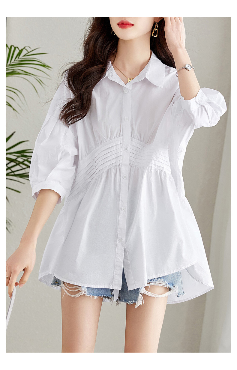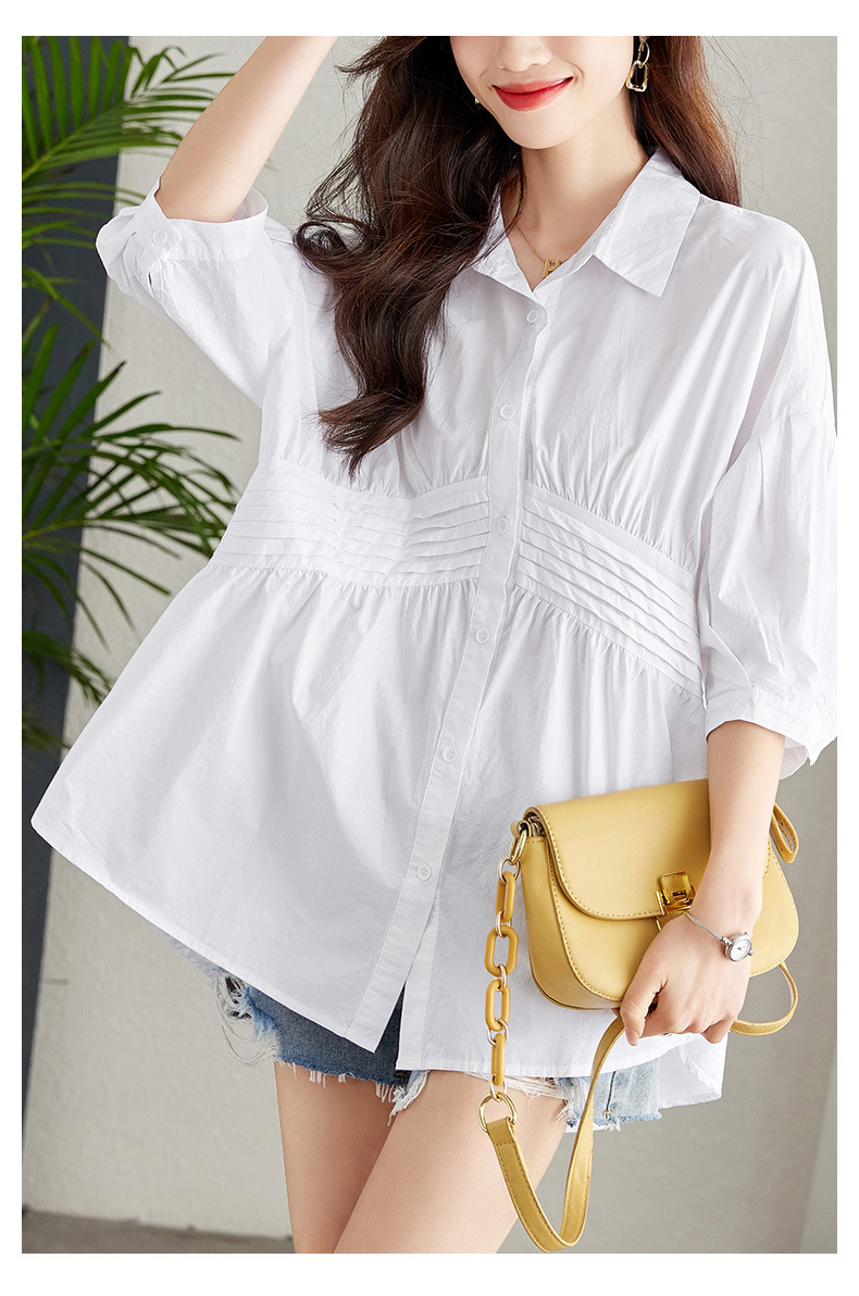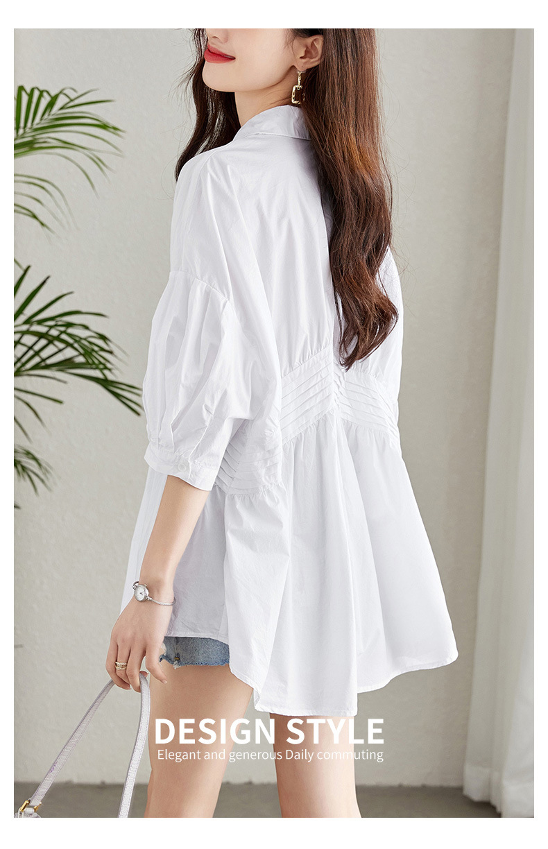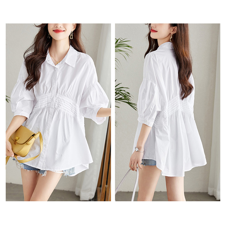 工場直販タッカープリーツ白シャツレディース夏七分袖デザインニッチシックトップAライン純綿シャツ