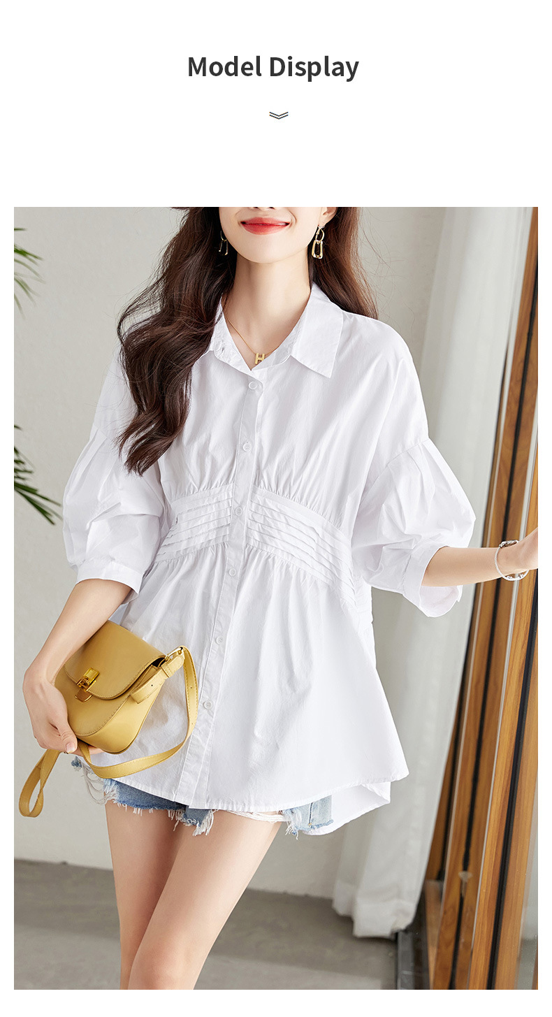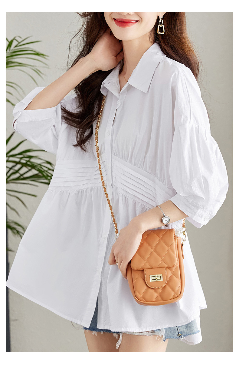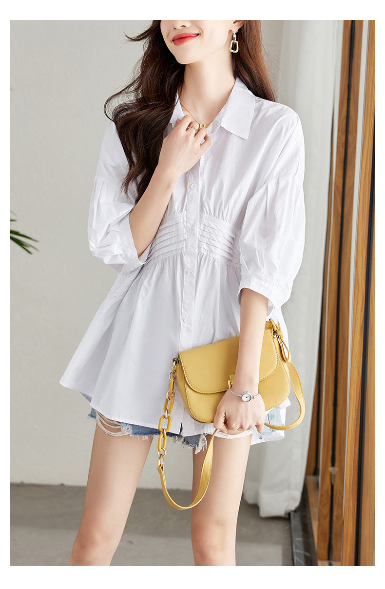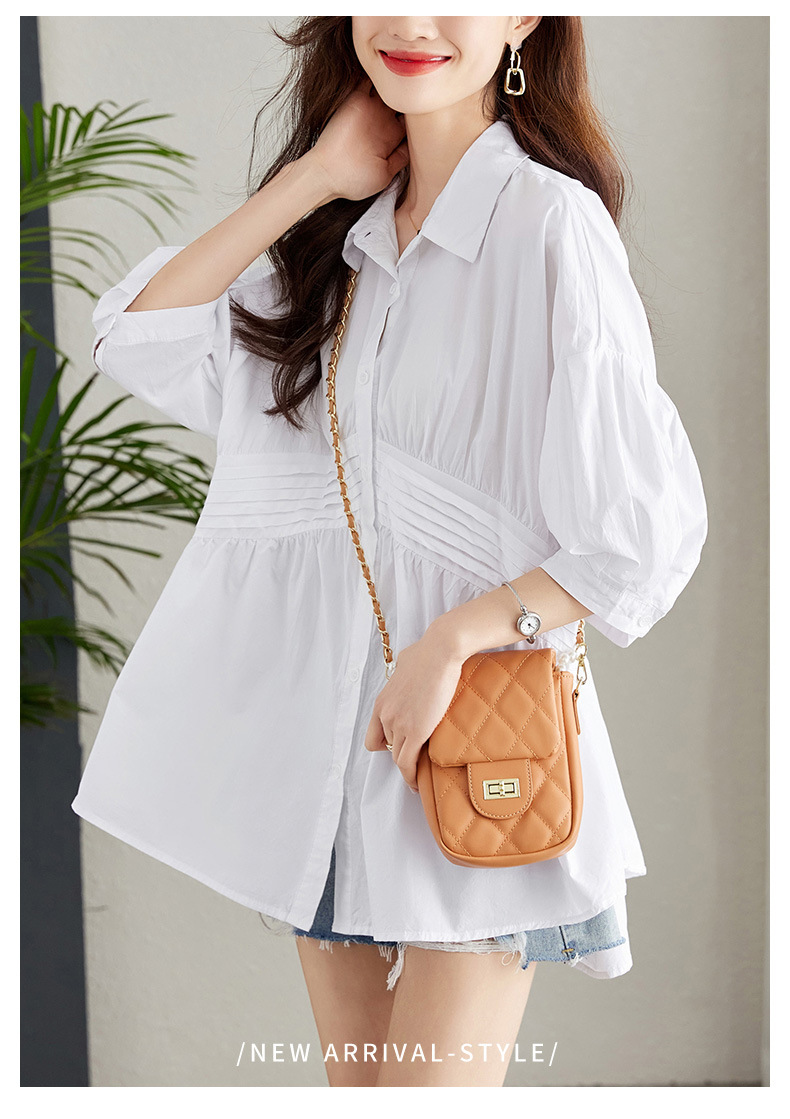工場直販タッカープリーツ白シャツレディース夏七分袖デザインニッチシックトップAライン純綿シャツ