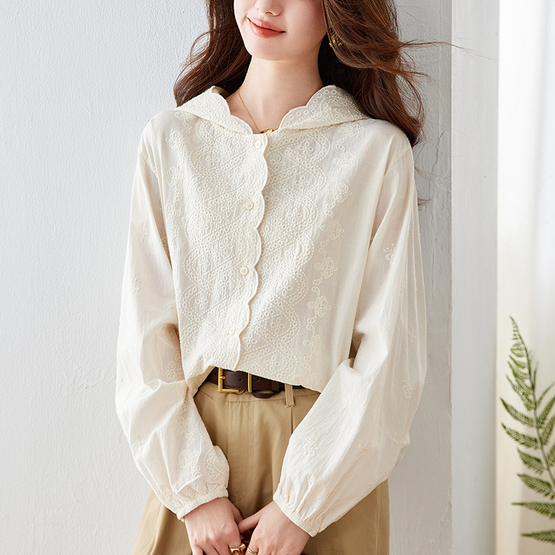 コットンコイルレース襟付きアプリコットカラー長袖シャツ レディース 2026春新作 デザイン性のあるニッチな刺繍フラワートップス