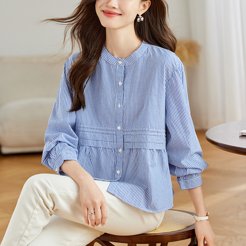 メーカー直売の青いストライプの純綿のシャツの女性の長袖の春の服の新型の木の耳元はゆったりしていてやせている上着の底のシャツを現します。