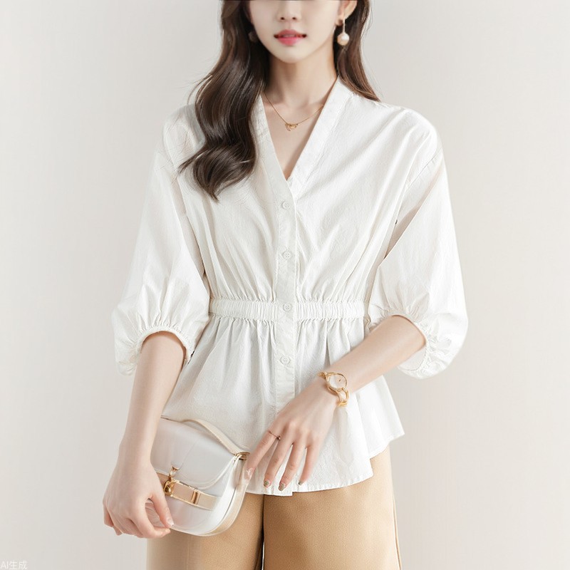 工場直販 プリーツ入りウエストシェイプ ドールシャツ レディース 五分袖 初秋 Vネックデザイン ゆったり 綿100%トップス