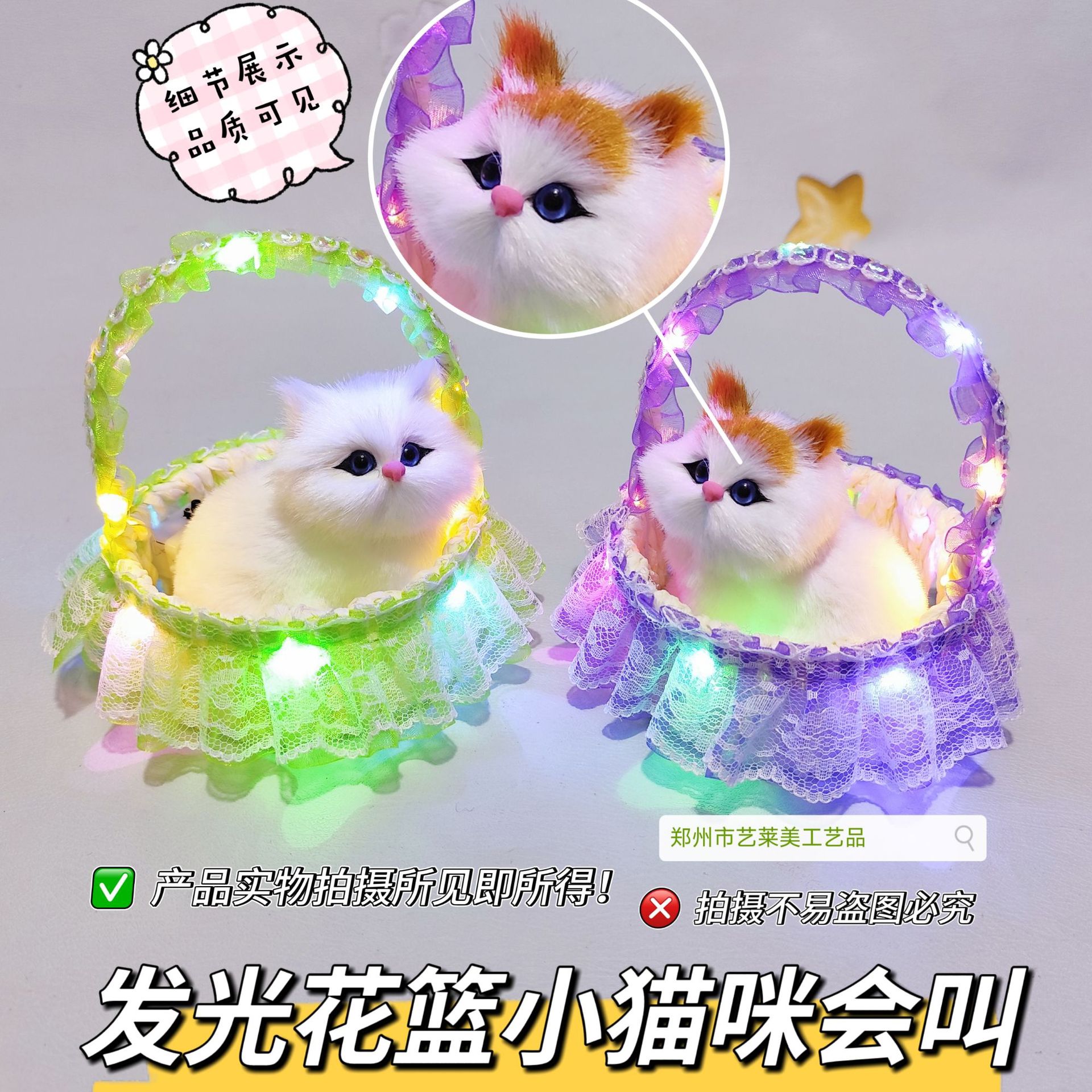 猫がかごを持っていると鳴く猫の発光バスケット子猫観光地区におもちゃの猫の花かご猫が飾られている