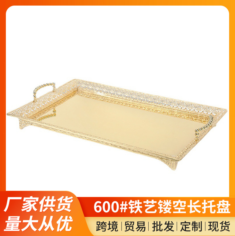 金色の軽くて豪華な金属のトレーの長方形の透かし彫りのお茶の皿の果物の皿の客間の家庭用の収納の長いトレーの卸売り