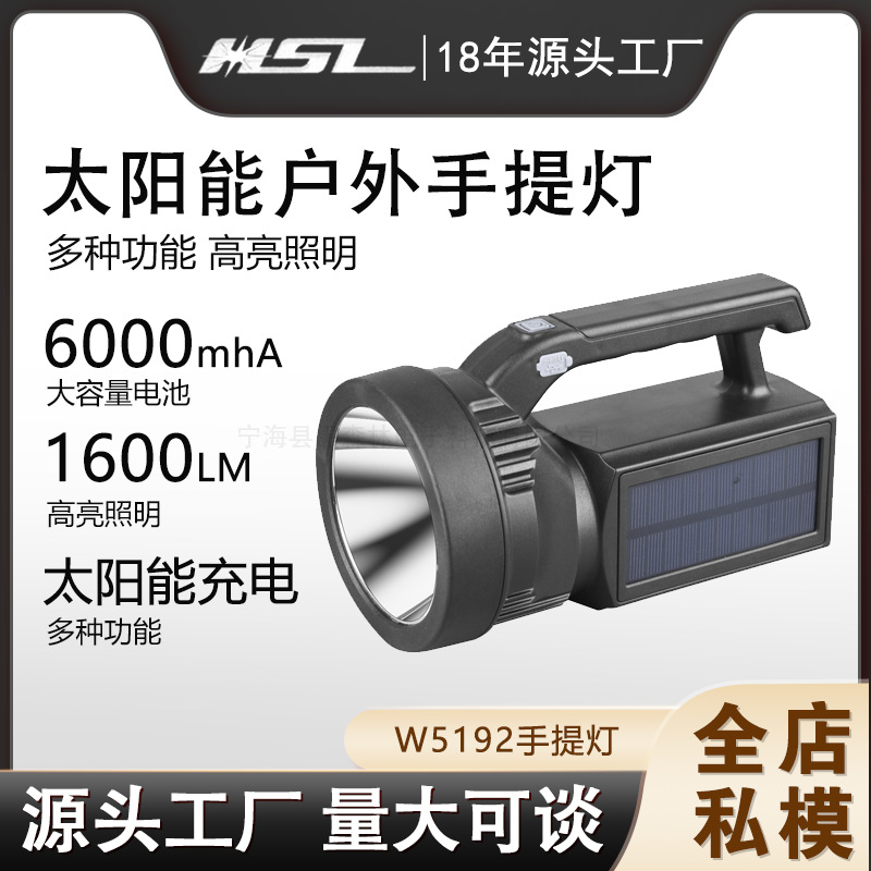 太阳能手提灯W5192充电超亮户外照明家用便携探照灯巡逻矿灯