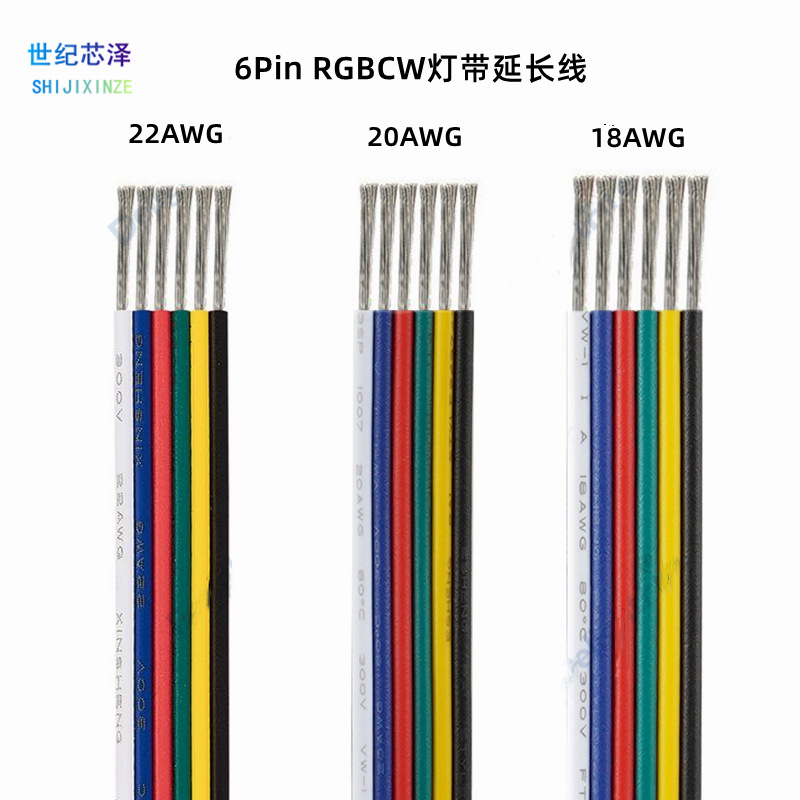 Ledライトケーブル付き6芯カラー並列線rgbcwライトケーブル付き延長コード6pin 22/20/18awg線
