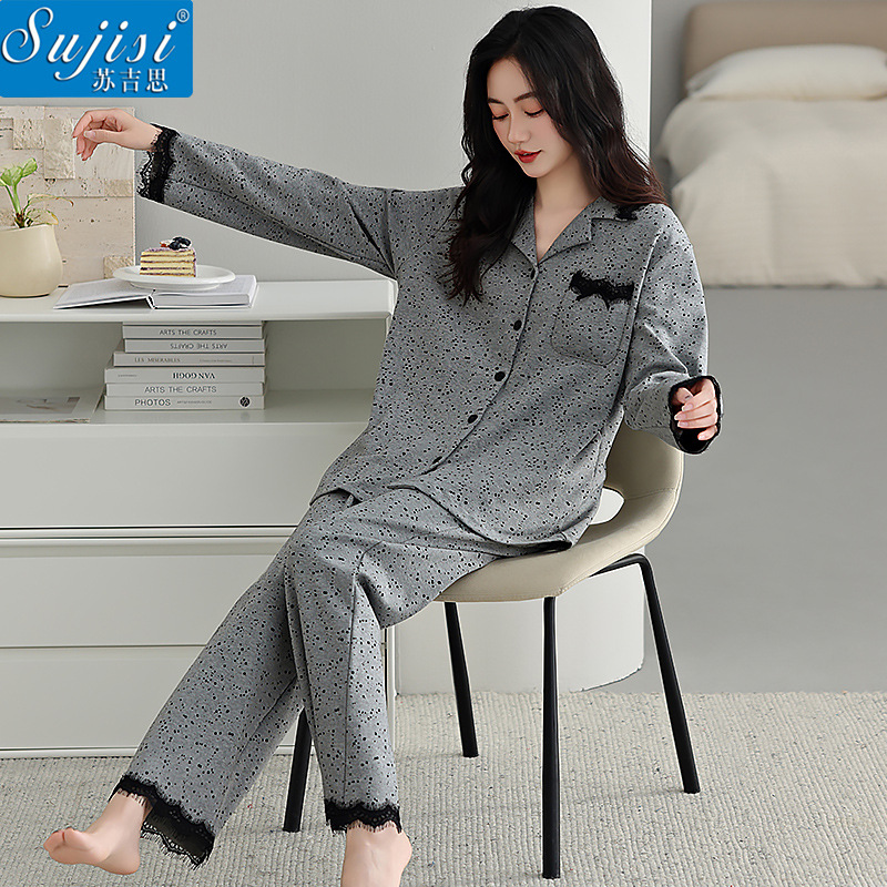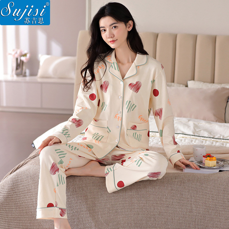 レディース純綿パジャマ秋冬新作長袖シンプルカーディガンプリントカジュアル大きいサイズホームウェア少女スーツ