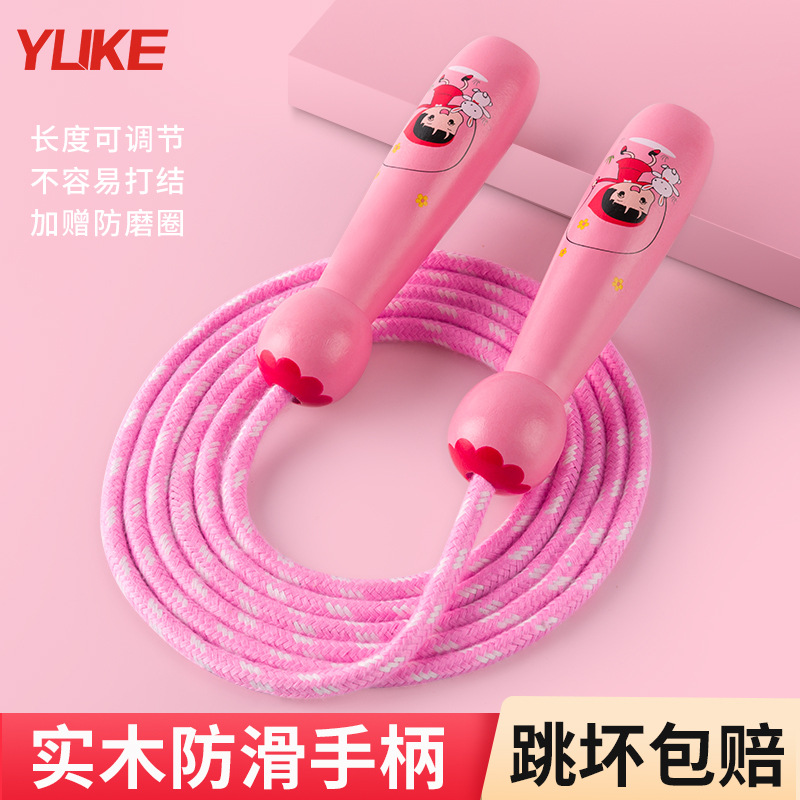 縄跳びのおもちゃの子供の木の小学生のスポーツの幼稚園は初めて男の子の女の子の縄跳びの木の取っ手の綿の縄を学びます。