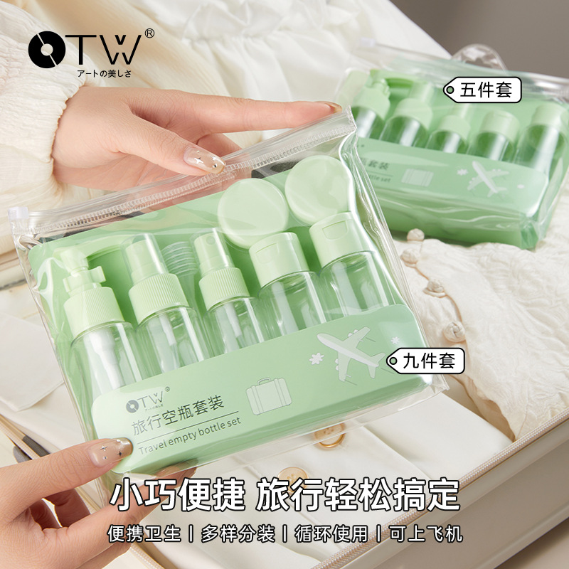 新款otw旅行分装瓶PET加厚透明按压瓶喷瓶膏霜瓶便携式九件套批发