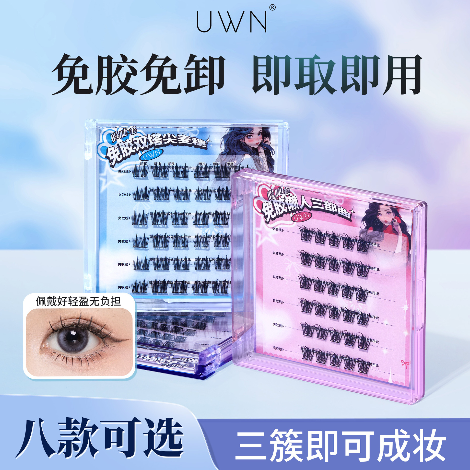 UWNは糊なしでまつげをつけます。三群は化粧になります。新米は自然に濃密で、上から下までまつげをつけます。
