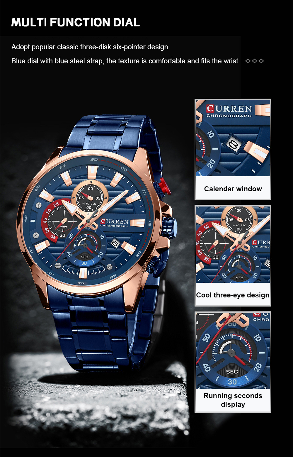 Currenカレン男性カレンダー腕時計防水大皿鋼帯男性時計多機能真六針石英腕時計