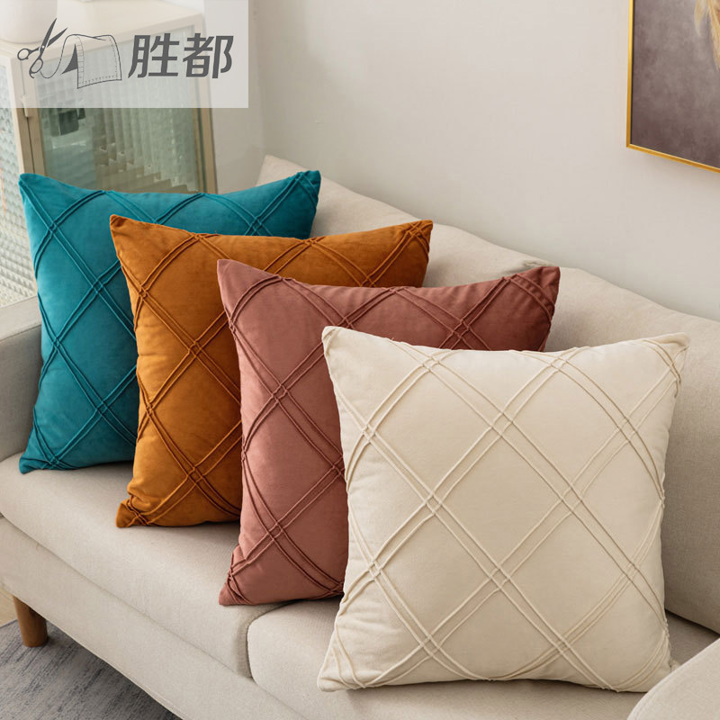 勝都枕芯付きシンプルクッション立体オランダベルベットリビングルームホームデコレーションソファクッション格子柄枕カバー