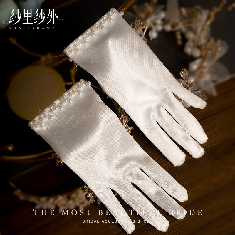 花嫁の結婚式の手袋のウェディングドレスはレースの真珠を飾って写真を撮って結婚式のサテンの短い卸売りの女性を撮影します。