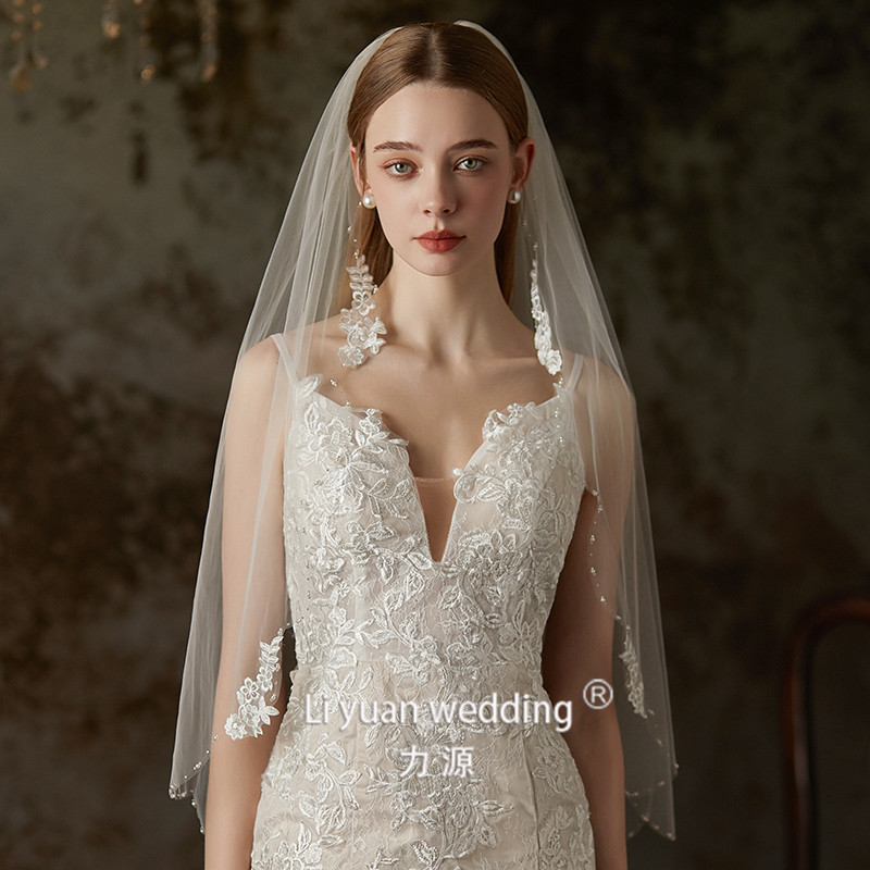 90 センチメートル単層ヘアコームレースフラワーピース縫製ビーズ花嫁結婚証明書旅行写真ベールロングスタジオ旅行写真