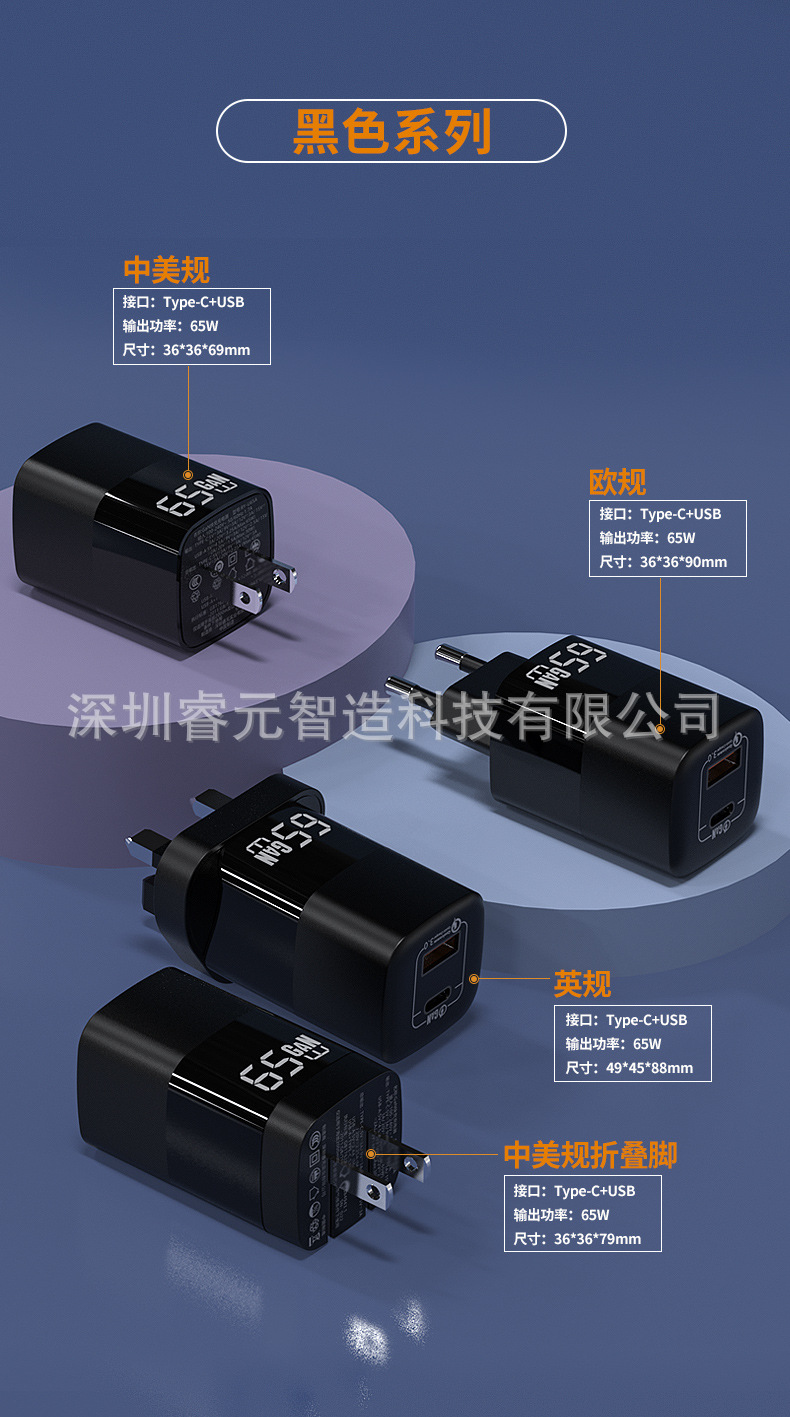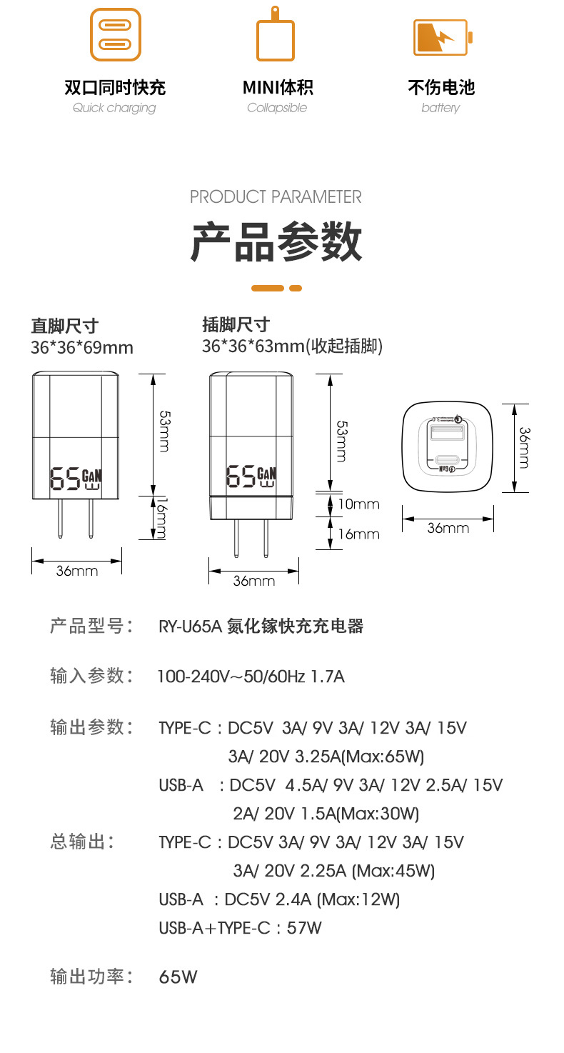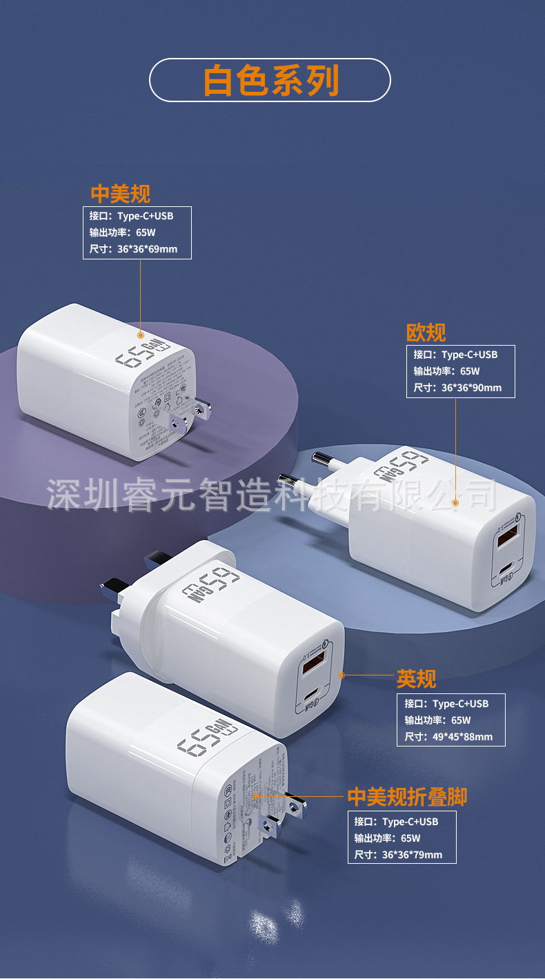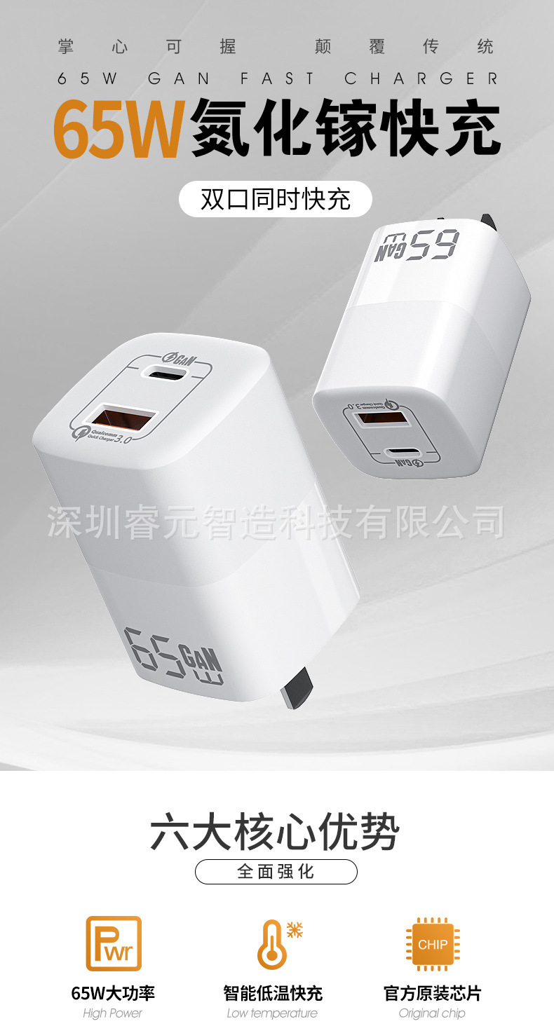 窒化ガリウム65Wハイパワー急速充電PD三口充電ヘッドはアップル華為安卓タブレット充電ヘッドに適している