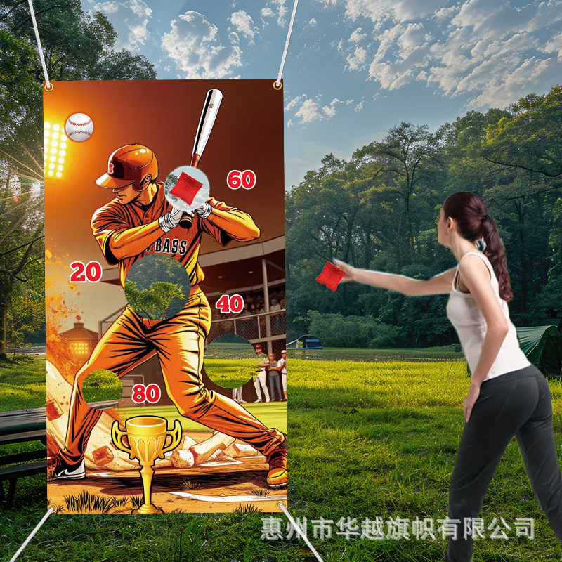 国境を越えたアマゾンは野球投げゲームの親子交流サンドバッグ旗の背景庭園の屋外で写真を作る