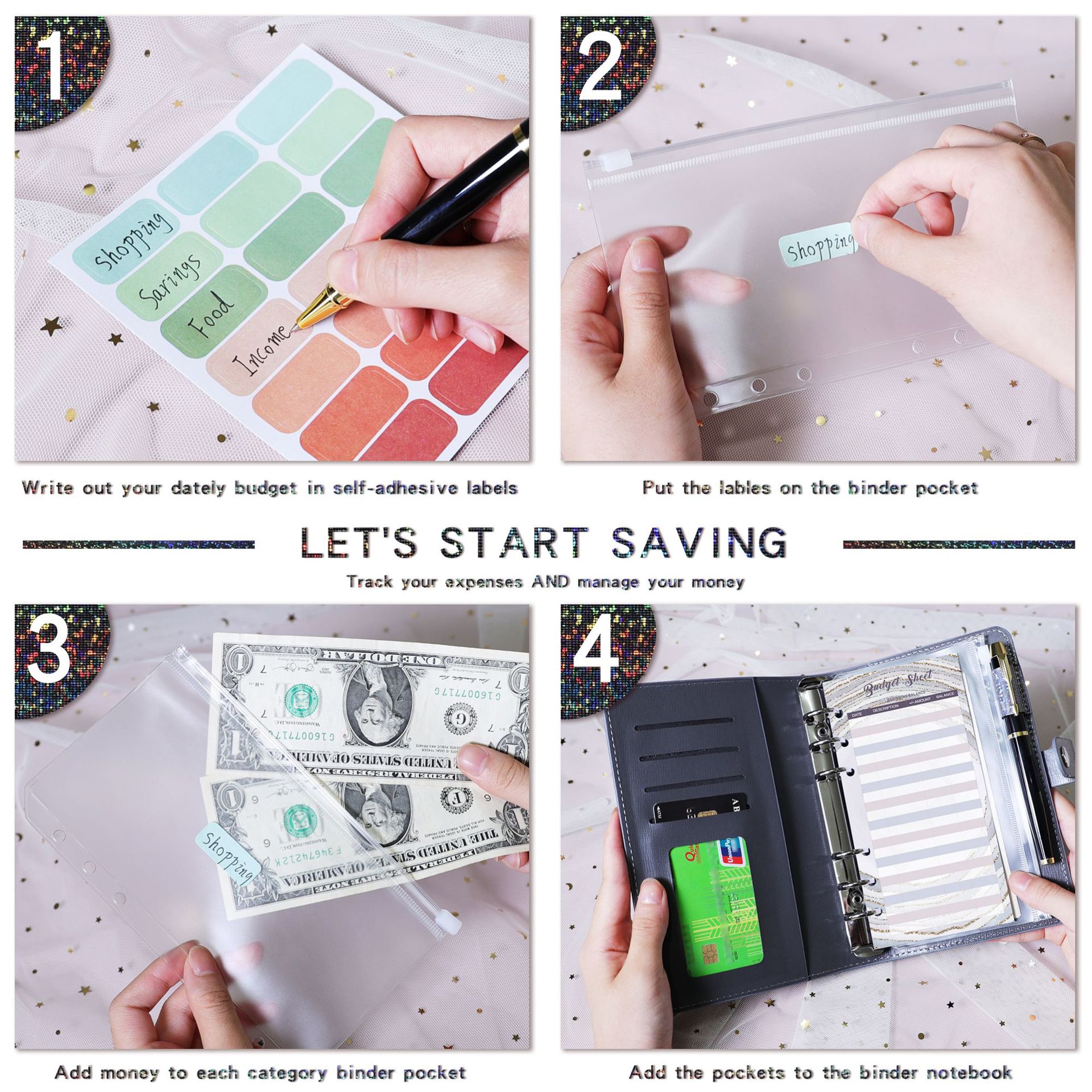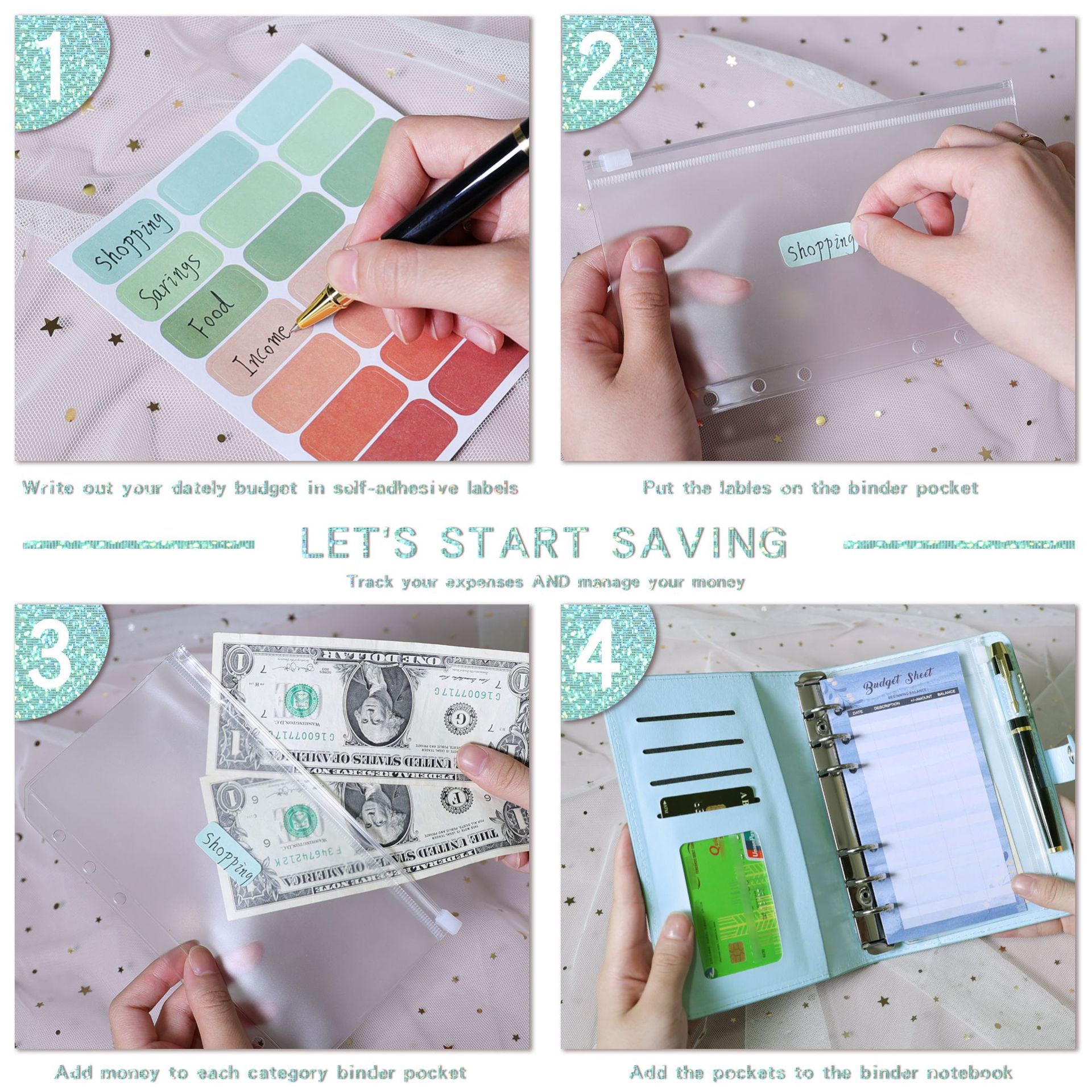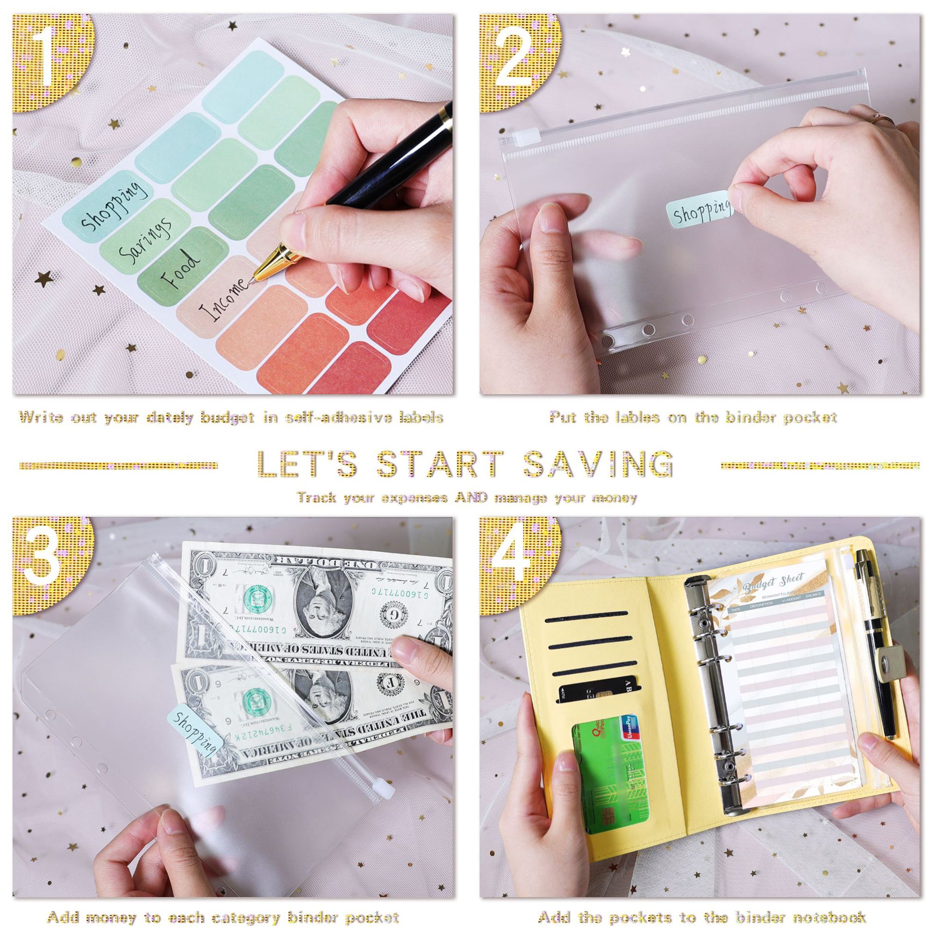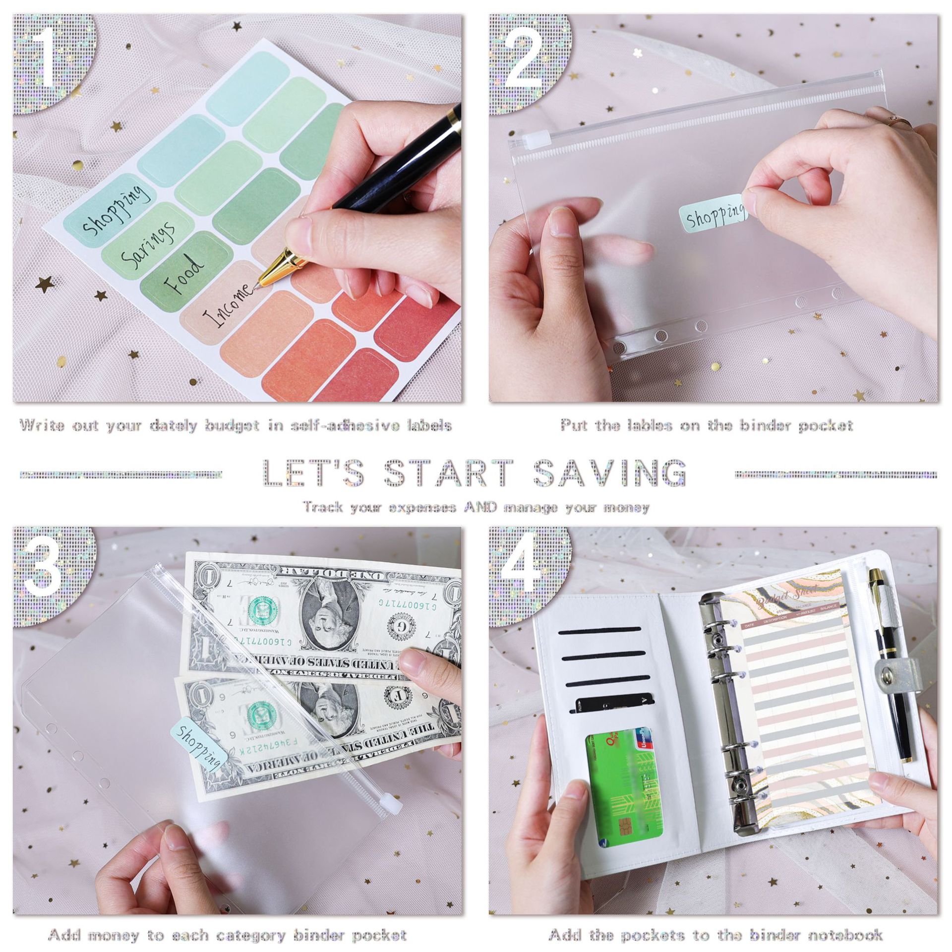 表紙の色 柔らかい面-満天星-ピンク (外皮1 + ジッパー袋12 + 金箔予算カード12 + スパンコール英語3 + 21枚ラベル1),柔らかい面-満天星-青 (外皮1 + ジッパー袋12 + 金箔予算カード12 + スパンコール英語3 + 21枚ラベル1),ソフト面-満天星-黒 (外皮1 + チャック袋12 + 金箔予算カード12 + スパンコール英語3 + 21枚ラベル1),柔らかい面-満天星-黄色(外皮1 + ジッパー袋12 + 金箔予算カード12 + スパンコール英語3 + 21枚ラベル1),ソフトフェイス-満天星-紫 (外皮1 + チャック袋12 + 金箔予算カード12 + スパンコール英語3 + 21枚ラベル1),柔らかい顔-満天星-銀白色(外皮1 + ジッパー袋12 + 金箔予算カード12 + スパンコール英語3 + 21枚ラベル1),ソフトフェイス-満天星-ピンク,ソフトフェイス-満天星-ブルー,ソフトフェイス-満天星-黒,柔らかい顔-満天星-黄色,ソフトフェイス-満天星-紫,柔らかい面-満天星-銀白色