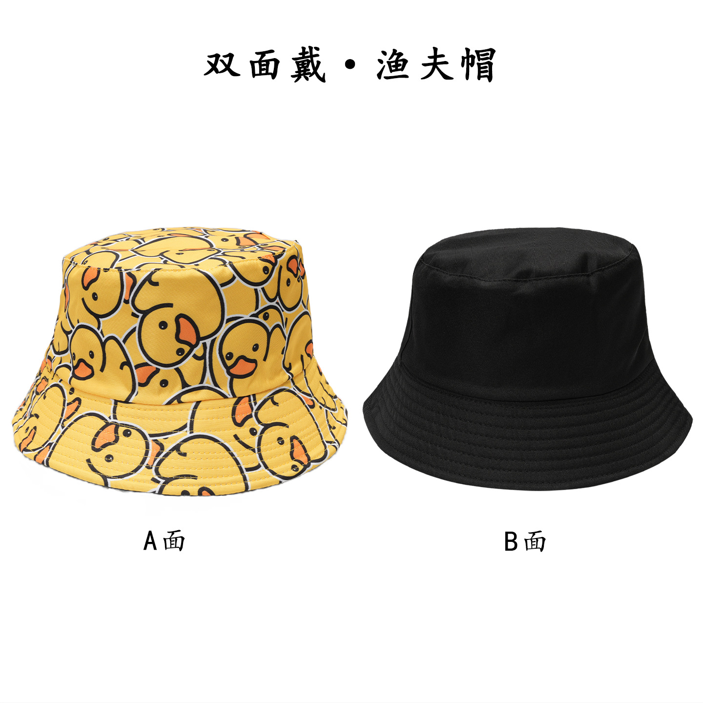外贸卡通小黄鸭双面渔夫帽韩版可爱图案遮阳防晒帽户外百搭显脸小