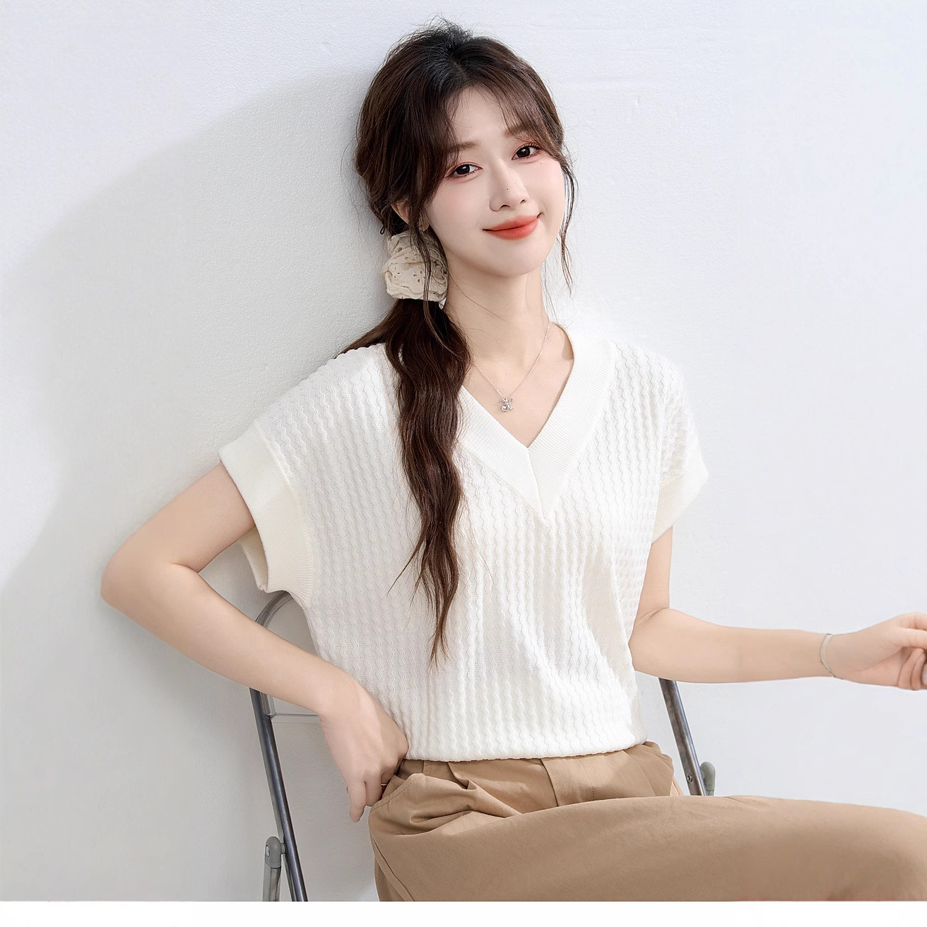 2025百合春夏新型フランスvネックニット半袖tシャツ女性がゆったりしていて痩せています。