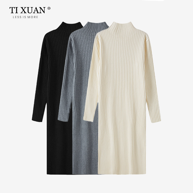 秋冬のコートのセーターのスカートの女性の半高襟のゆったりした長袖の中に中の長いタイプを掛けて底を打って膝のニットのワンピースをオーバーします。