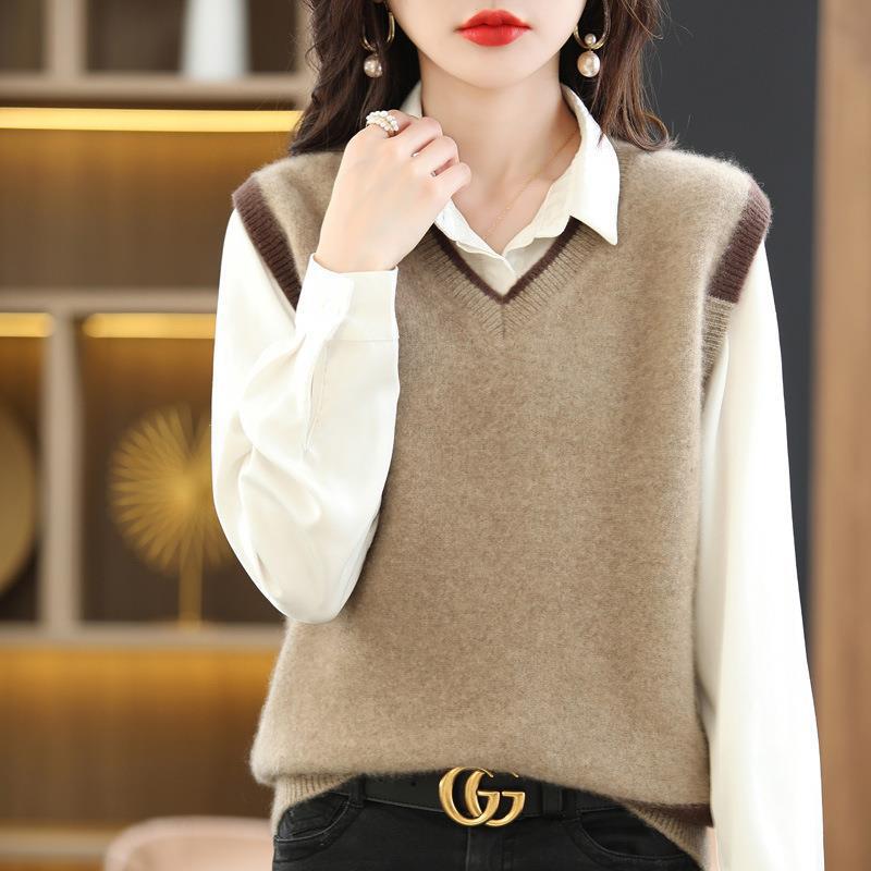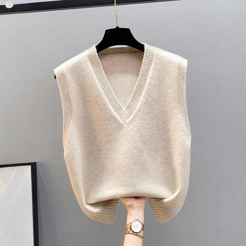 秋冬の女性用Vネックニットベスト、新しいゆったりとしたレイジースタイルのレイヤードプルオーバーボトムセーターベストアウター