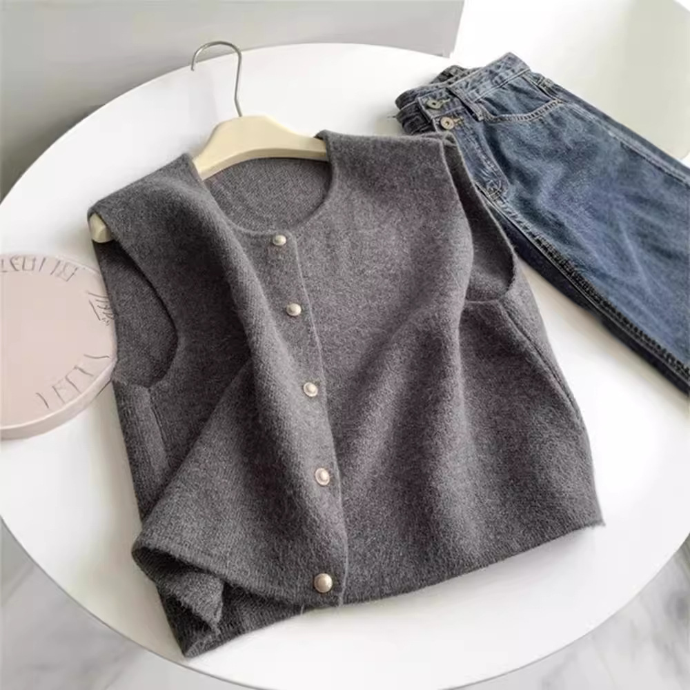 2025年春秋新作レディースファッション、万能ニットベスト、カーディガン風ベスト