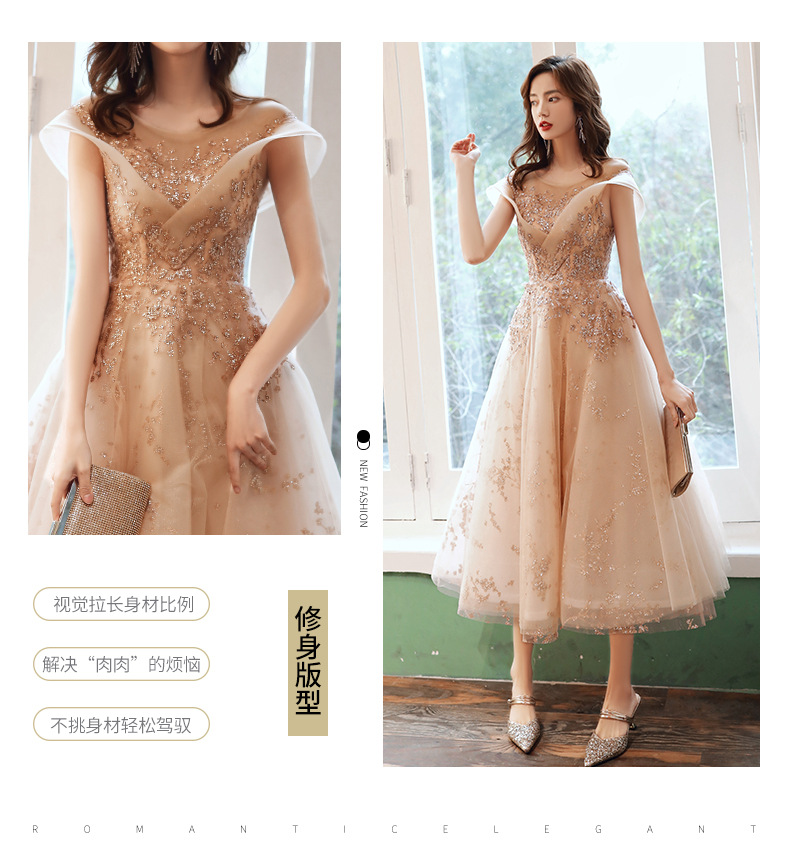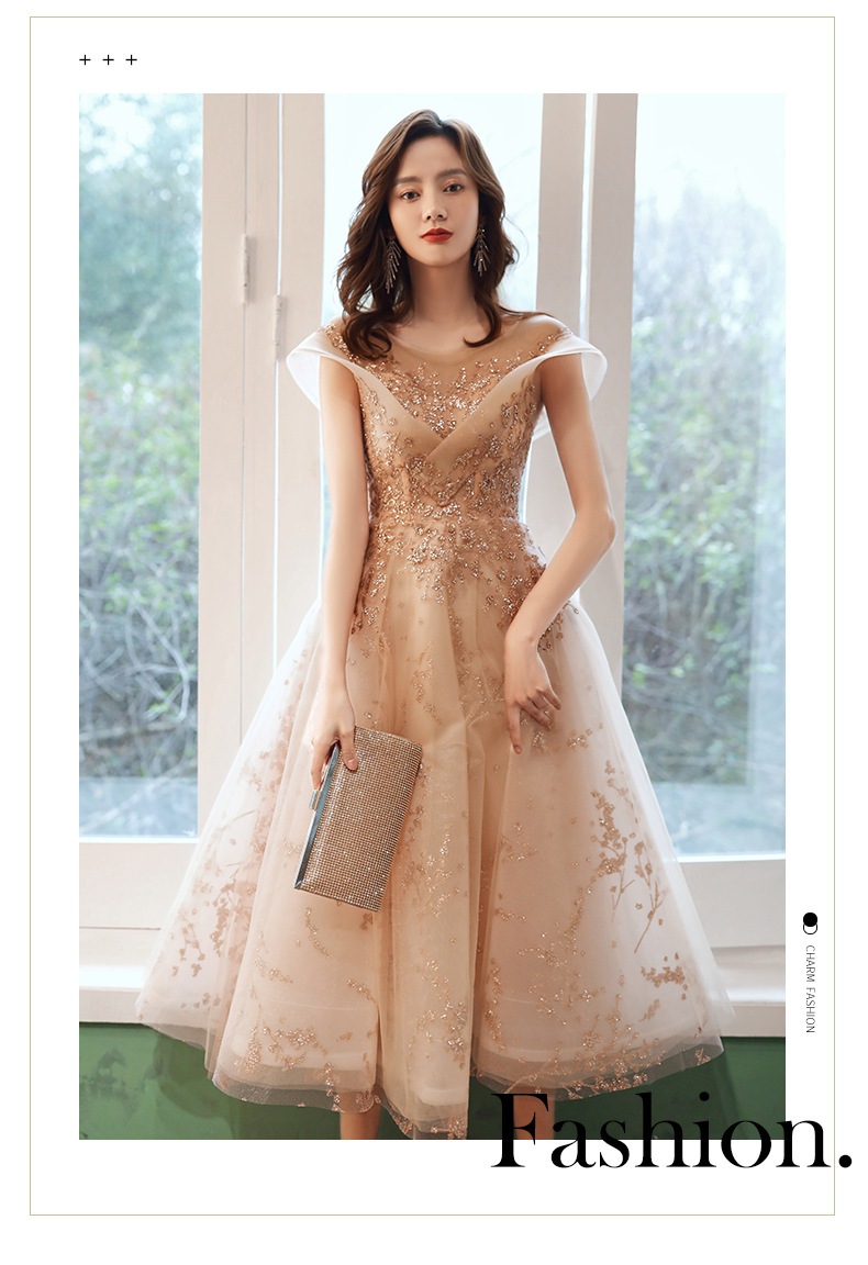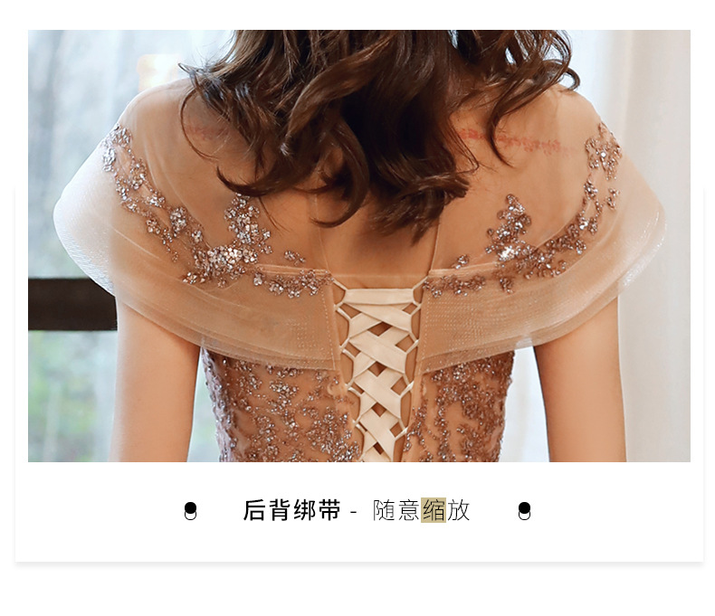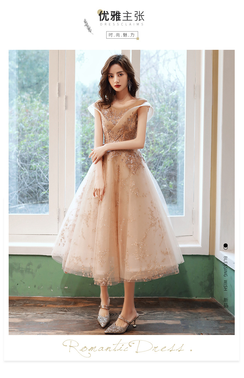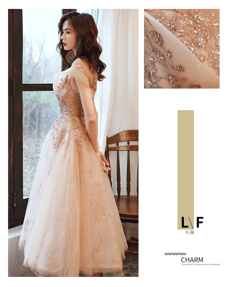 シャンパンカラーのイブニングドレス女性用2025新作宴会スタイルセレブ妖精風ホステス重厚年次パーティードレス
