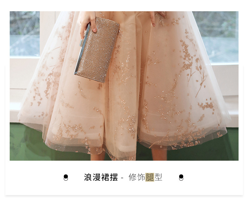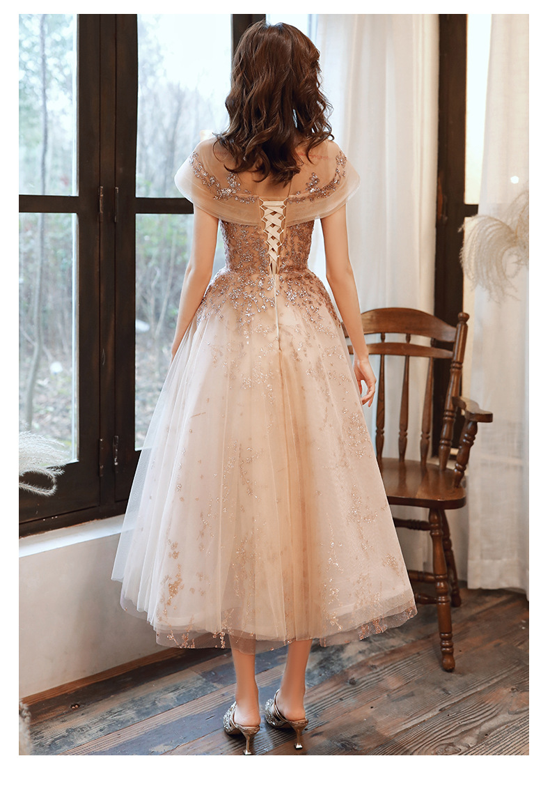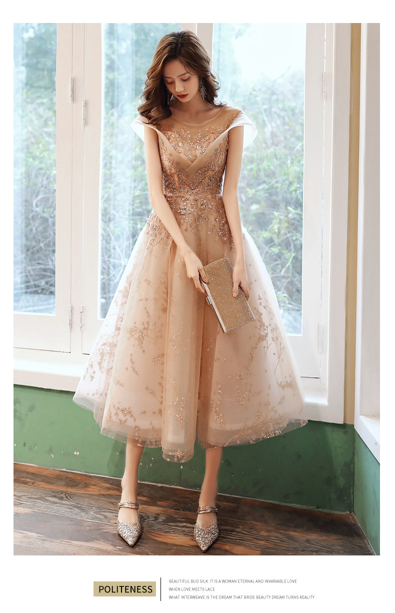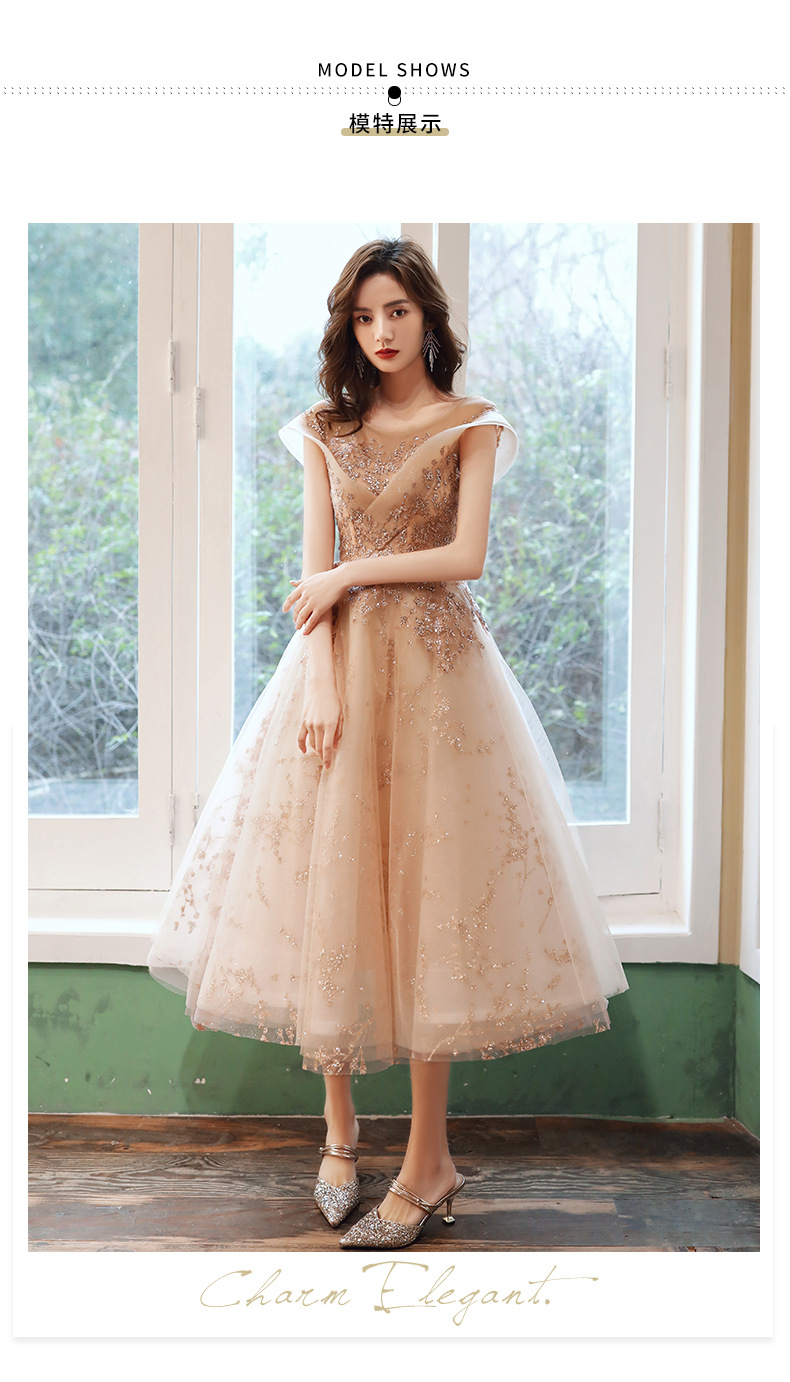 シャンパンカラーのイブニングドレス女性用2025新作宴会スタイルセレブ妖精風ホステス重厚年次パーティードレス