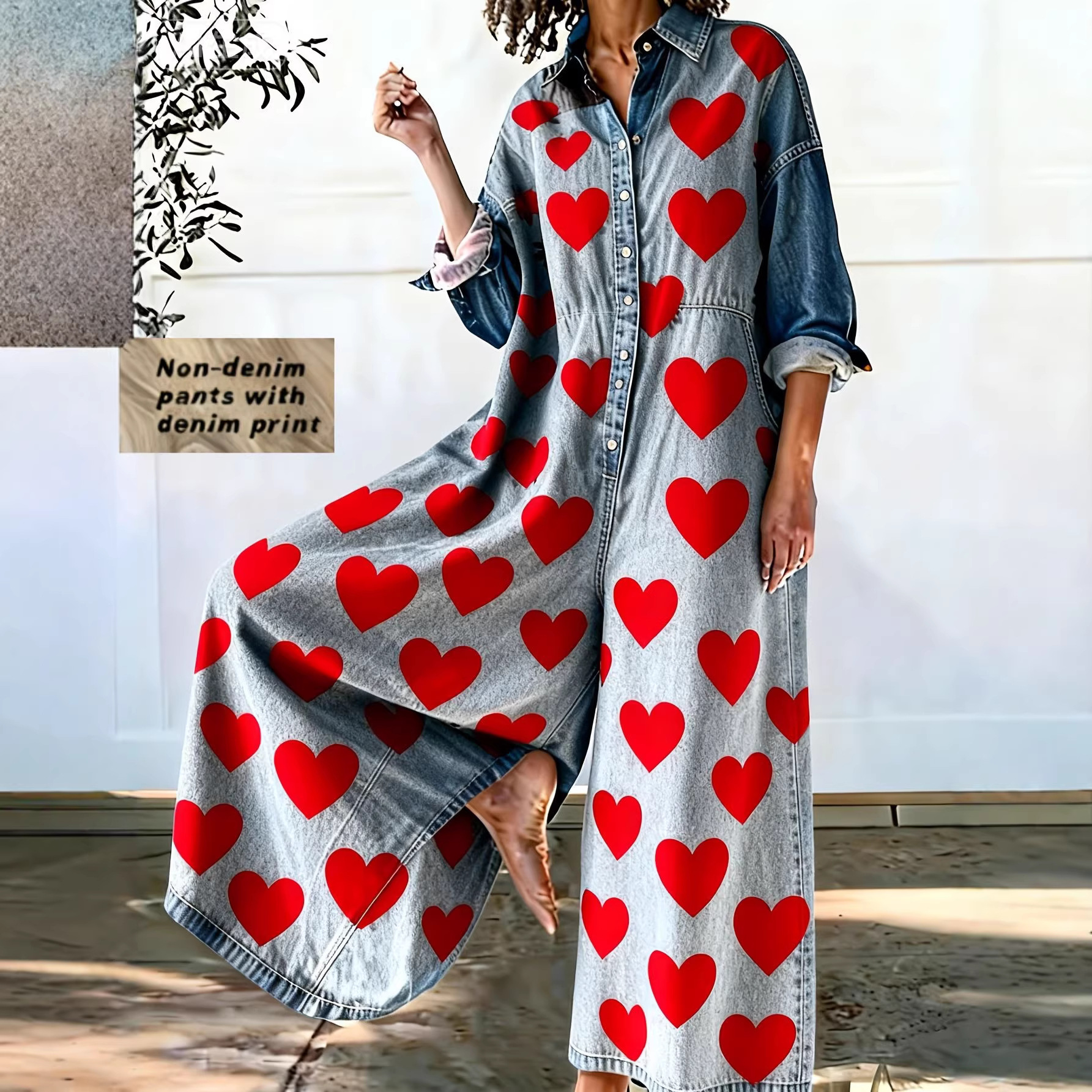 跨境欧美2026春夏复古爱心印花连体阔腿裤仿牛仔水洗宽松休闲