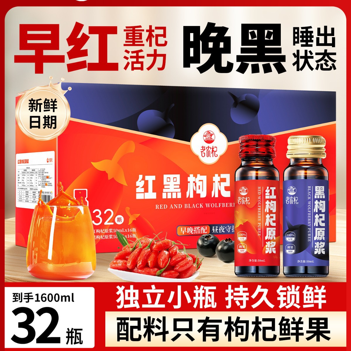 老农杞红黑枸杞原浆32瓶/箱现货批发源头工厂高浓度原浆礼盒装