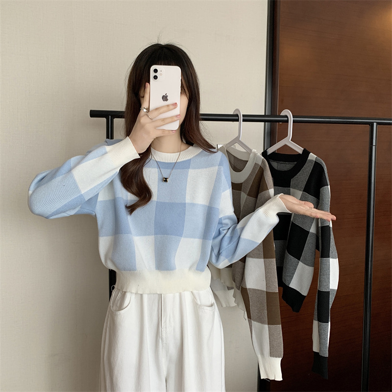 春の韓国版は色の格子の短いセーターにぶつかります。