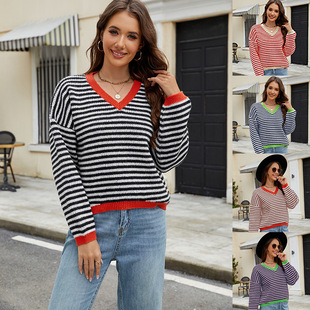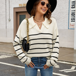 クロスボーダー代理shein婦人服ネット赤起爆ストライプセーターゆるい怠惰な長袖プルオーバー丸襟ニット