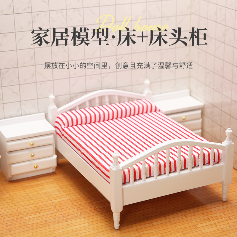 1:12人形屋dollhouseミニ家具寝室マイクロシーンモデルヨーロッパ風木製布芸ツインベッド