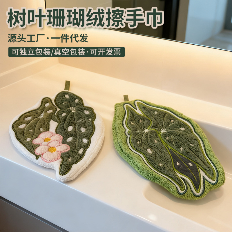 叶子擦手巾可挂式家用厨房卫生间清洁毛巾加厚吸水珊瑚绒擦手帕