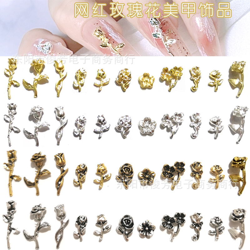 新品レトロダーク系パンク风メタル合金ローズ花ネイルアクセサリー立体ツバキ花爪饰り