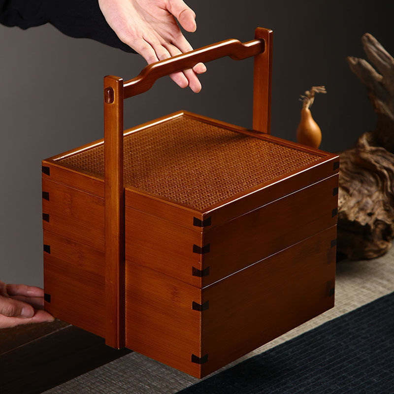ほぞ卯構造木製バスケット実木二重月餅包装箱木製手提げ箱野食箱キャンプ食箱