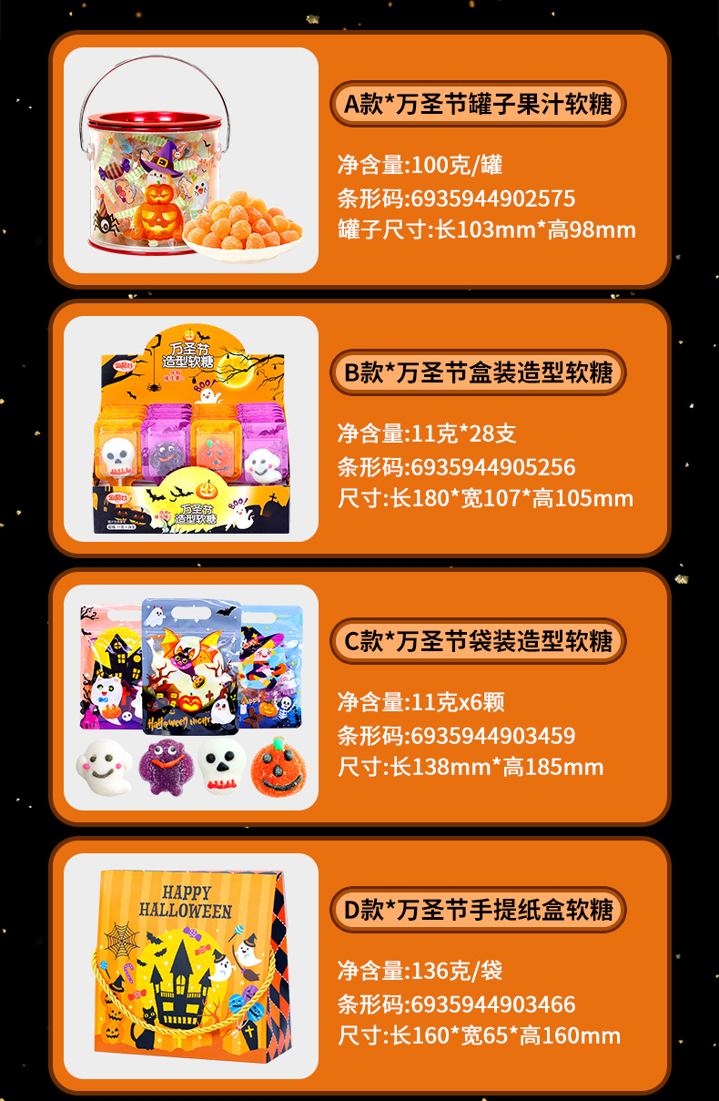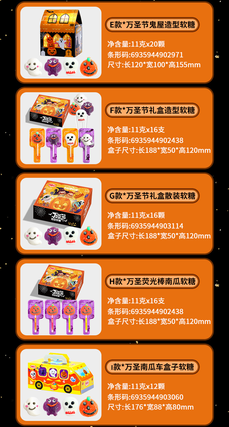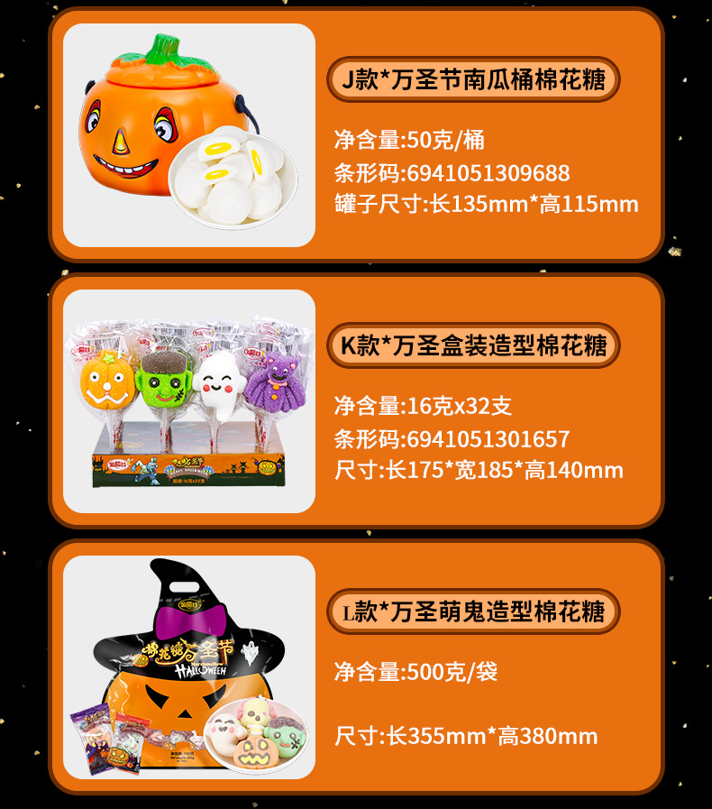 パッケージ仕様 ハロウィンマシュマロ 500g(約50個),16g×32個/箱 ハロウィンマシュマロ,11g×28個/箱 ハロウィングミキャンディ,グミキャンディ 100g ハロウィンキャンディージャー,11g*20カプセル/箱-ハロウィンキャンディハウス,11g*16個/箱-ハロウィングミキャンディ,11g*16カプセル/箱-ハロウィングミキャンディ,11g*16本/箱-パンプキンヘッドグロースティック,60g/箱 - ハロウィンロリポップ6個入り,11g*12カプセル/箱-ハロウィンパンプキンカー,50gサンドマシュマロパンプキンジャー