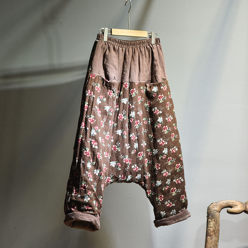 宽松中裤 翻边裤脚+手缝印花补丁 侧袋手工缝线