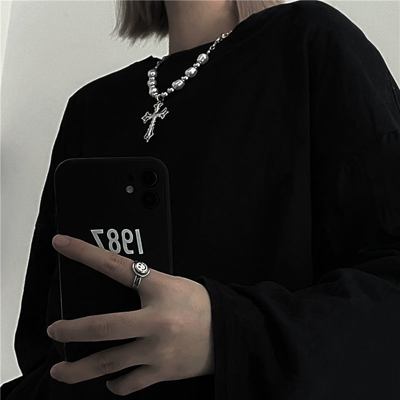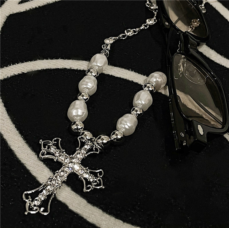 インスタイル ヒップホップ レトロ パール ネックレス パンク シンプル ヨーロッパとアメリカの甘くてクールなダークスタイル クロス ペンダント 鎖骨チェーン