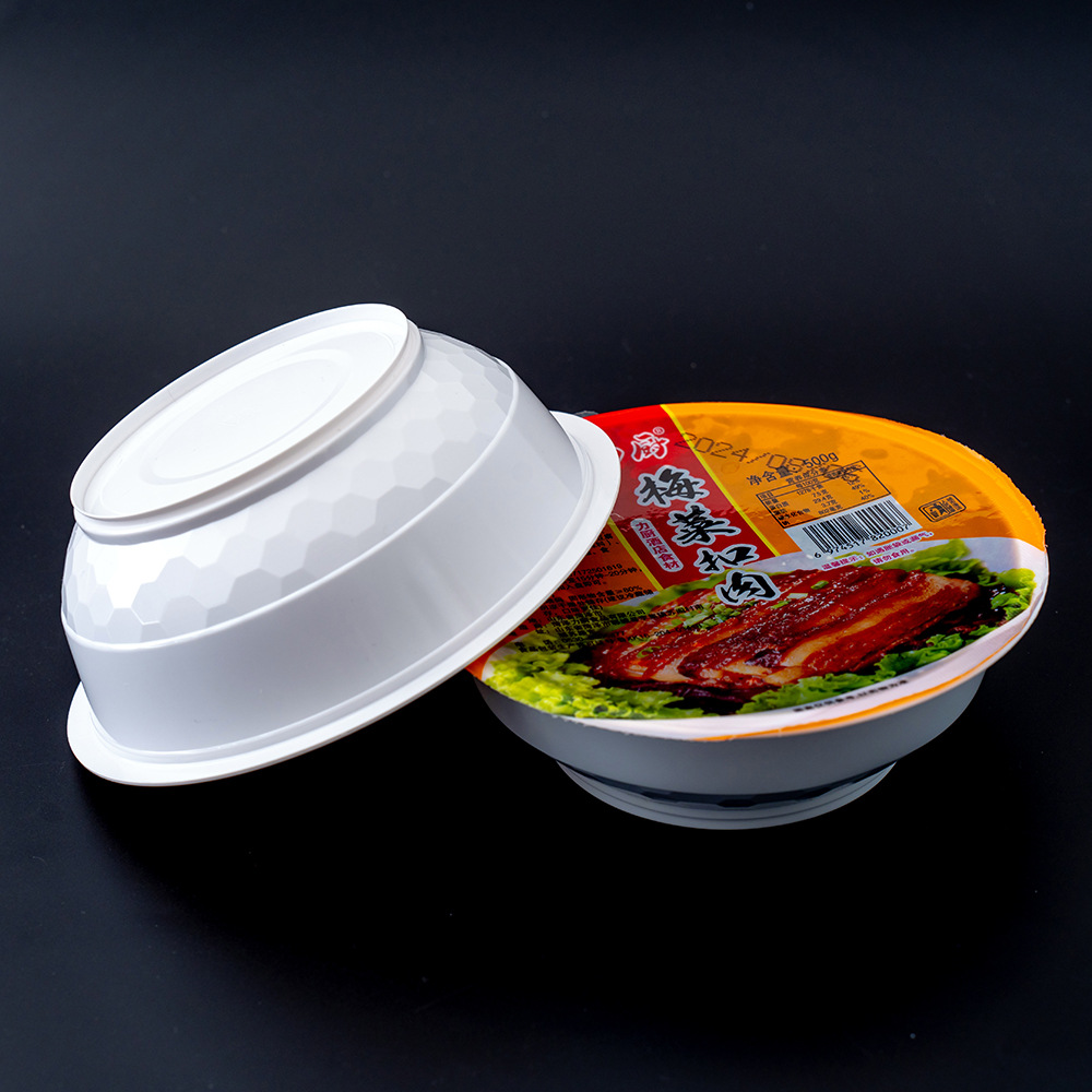 该产品是公司全新生产的用于各种口味梅菜扣肉的耐高温耐低温方便菜塑料碗,该盒采用食品级材料制作而成,耐高温121度,耐低温冷冻-30度,可用于包装各种口味梅菜扣肉,黄袍扣肉,东坡扣肉,水晶夹沙,坨子肉,八宝饭、米饭,卤肉 皮冻,盖浇饭等制品包装碗可封pp膜或者铝箔膜。