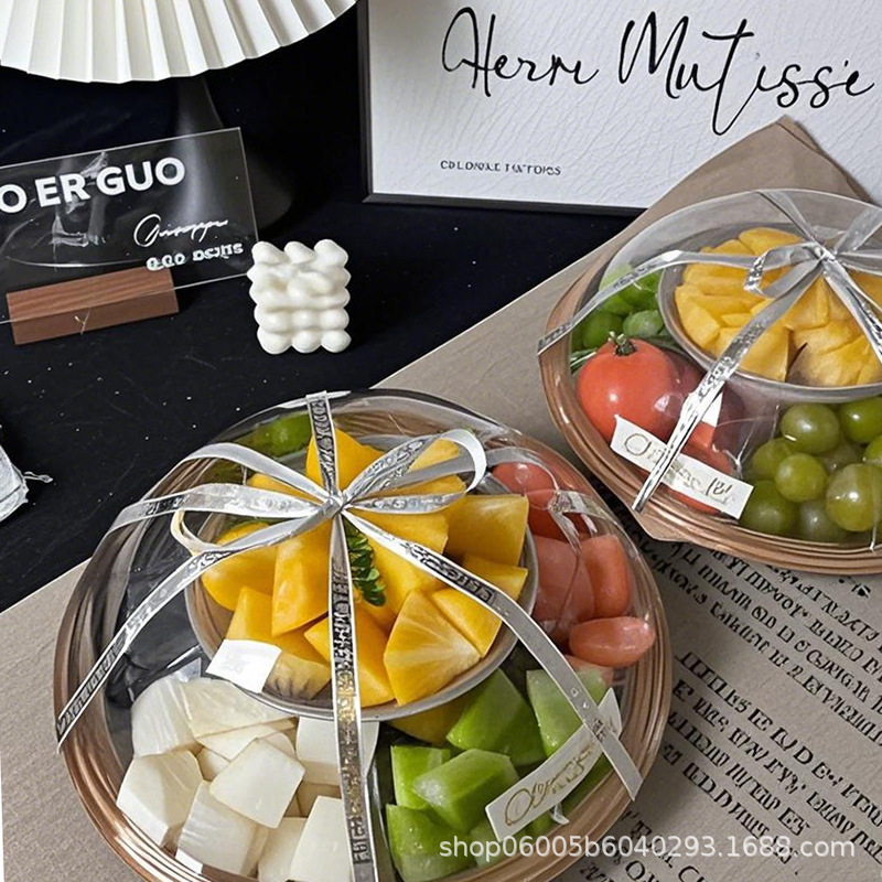 双层水果打包盒六分格水果果切拼盘一次性圆形透明带盖鲜果包装盒